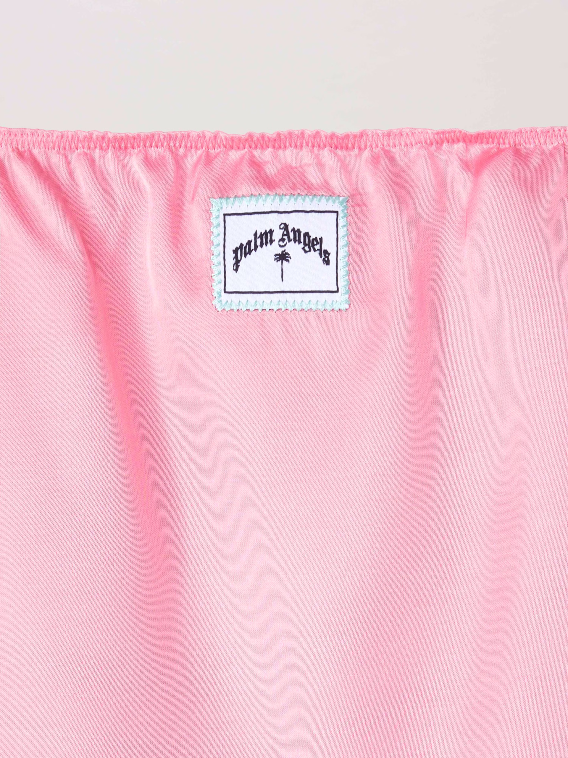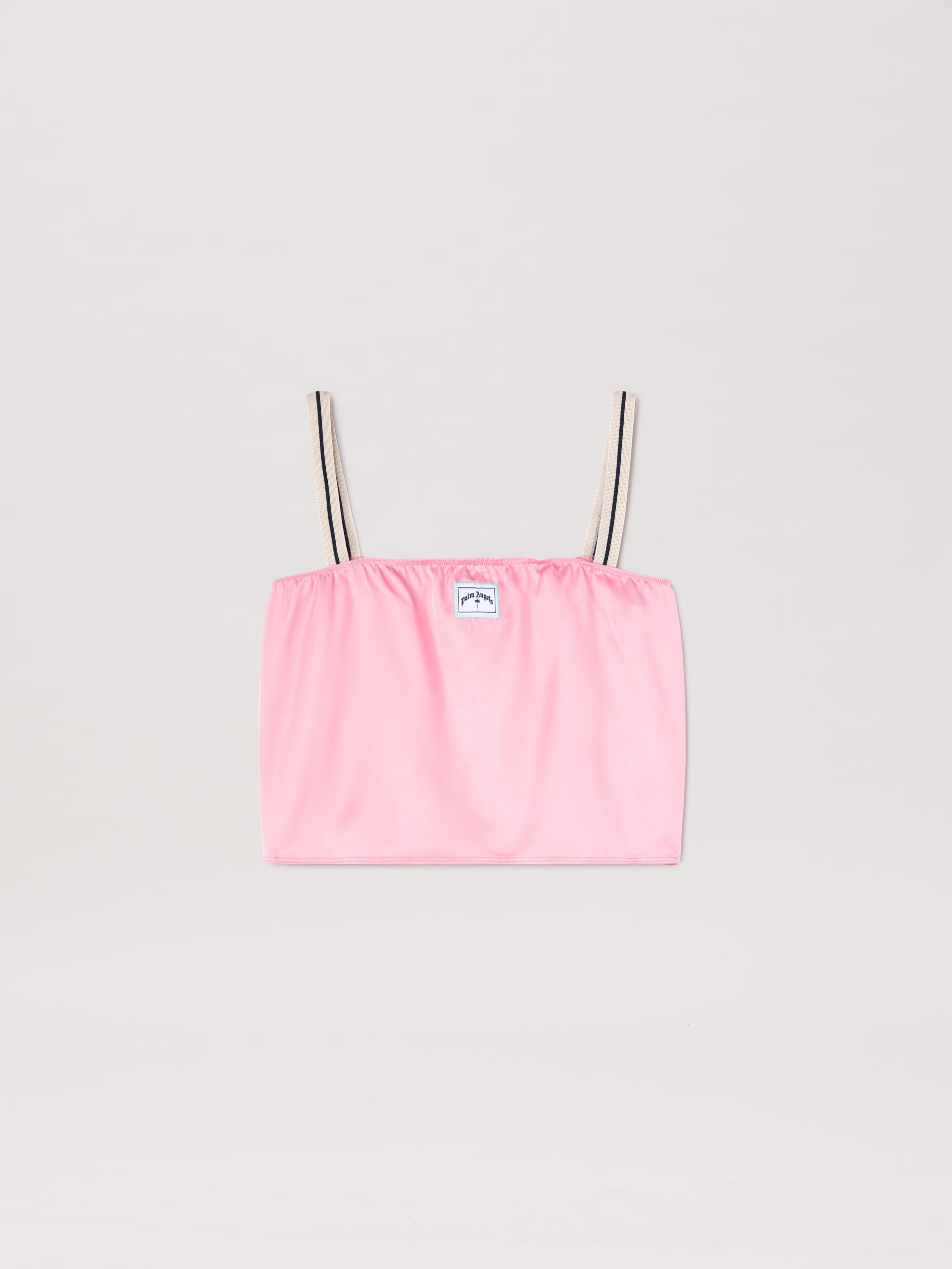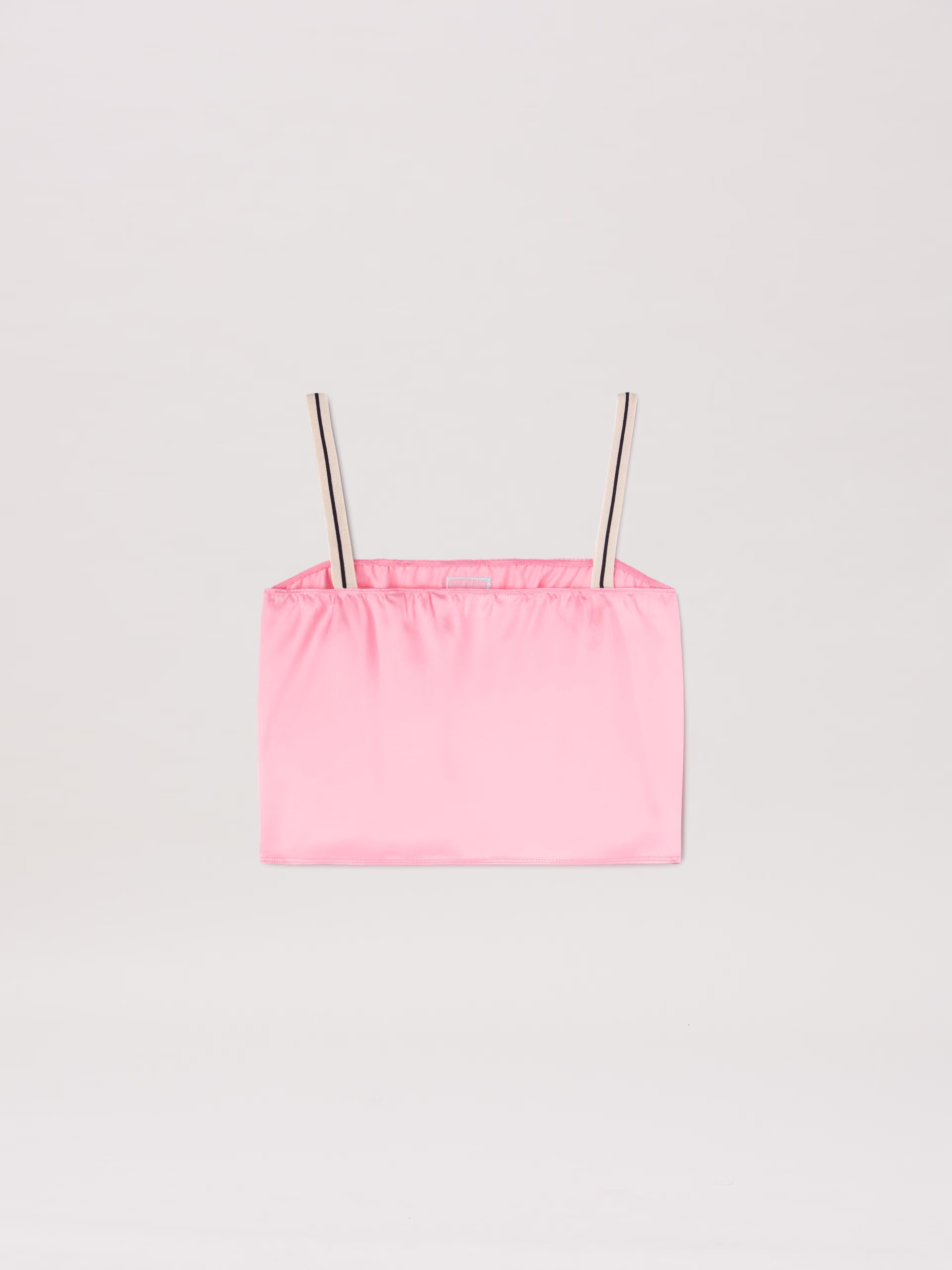 The iconic Tape of the tracksuit moves and integrate new decorative functions. Girl’s pink satin cropped top, with iconic Tape str