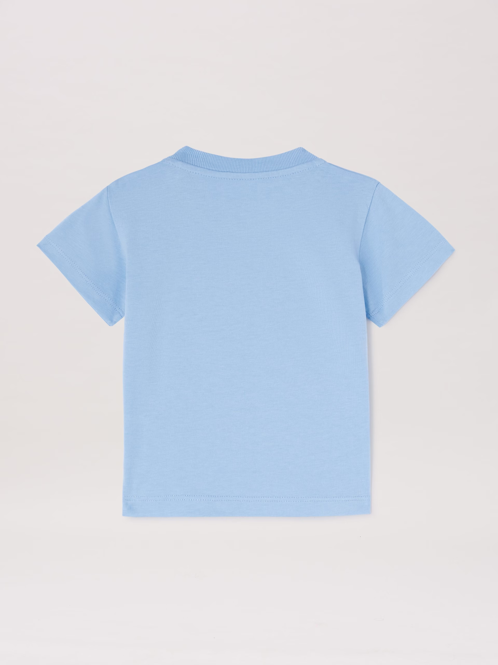 Funny and irreverent: kids’ world icons flipped and reimagined. Newborn baby boy’s light blue short-sleeved T-shirt with button o