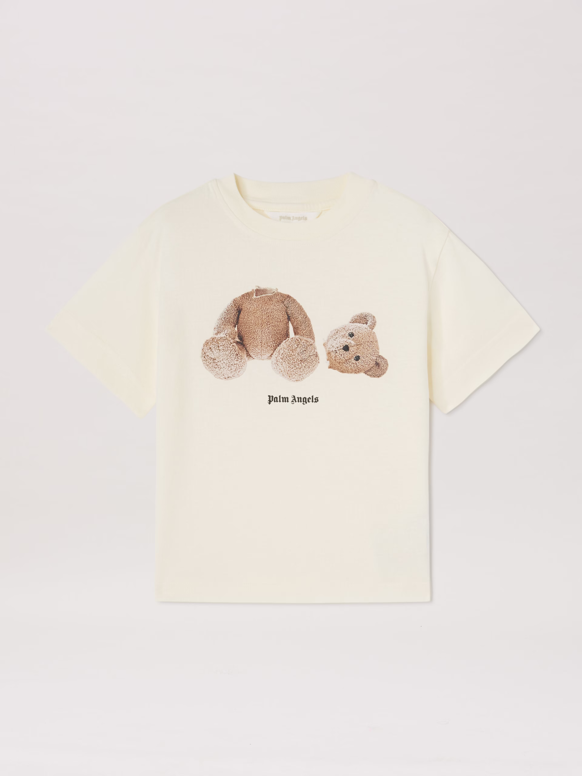 The playful Teddy Bear T-shirt in off-white color featuring the Palm Angels logo printed in black beneath a teddy bear graphic.