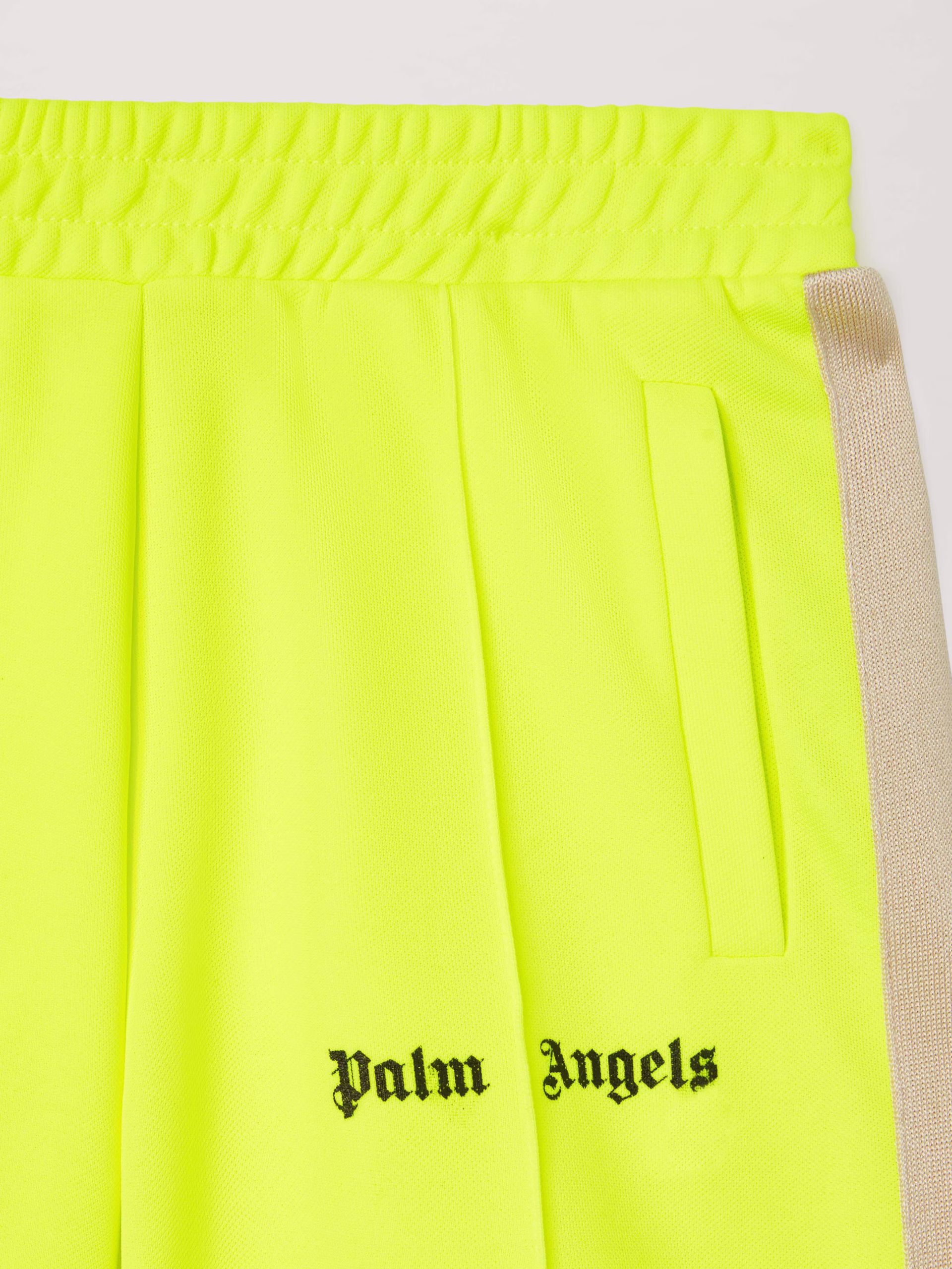 An all-time favorite and a Palm Angels icon that crosses generations. Boy’s yellow fluo track shorts with vertical pockets, Iconi