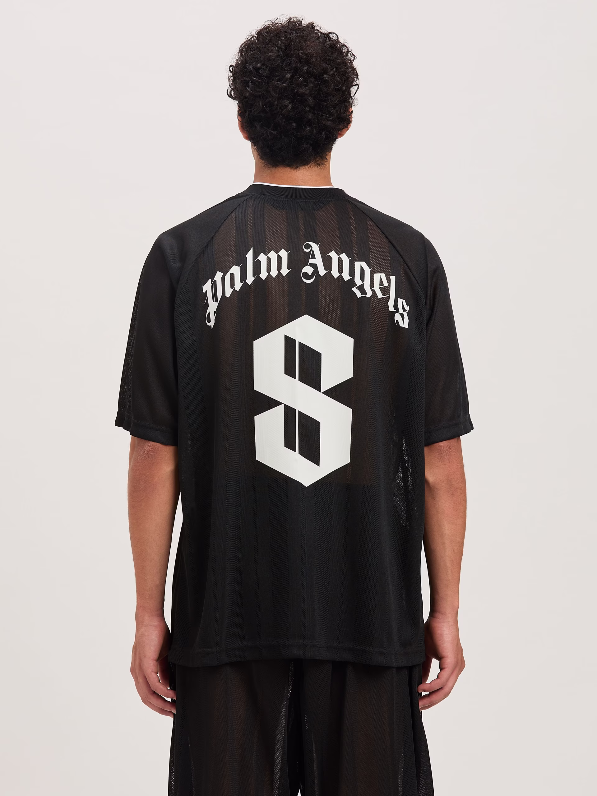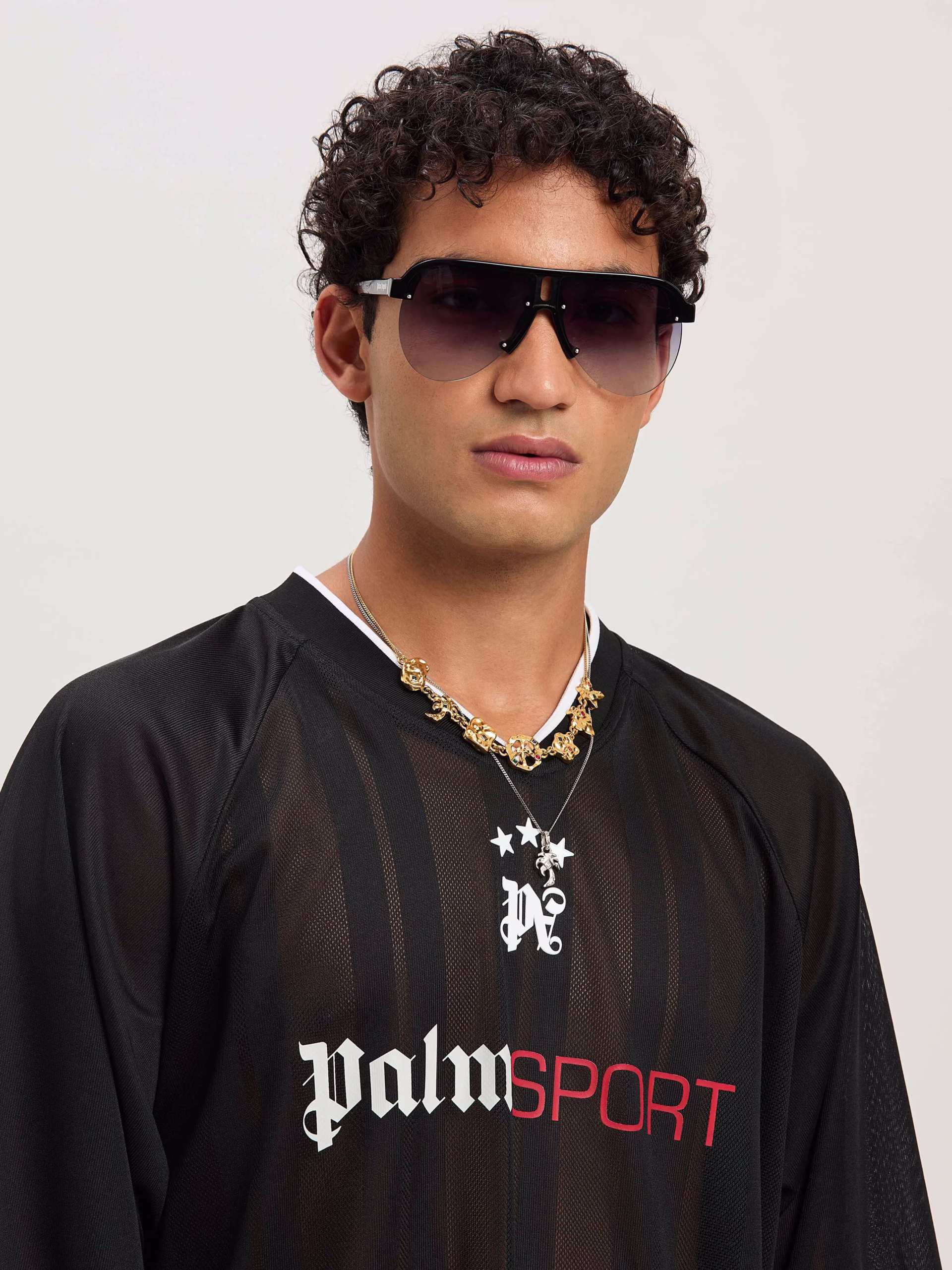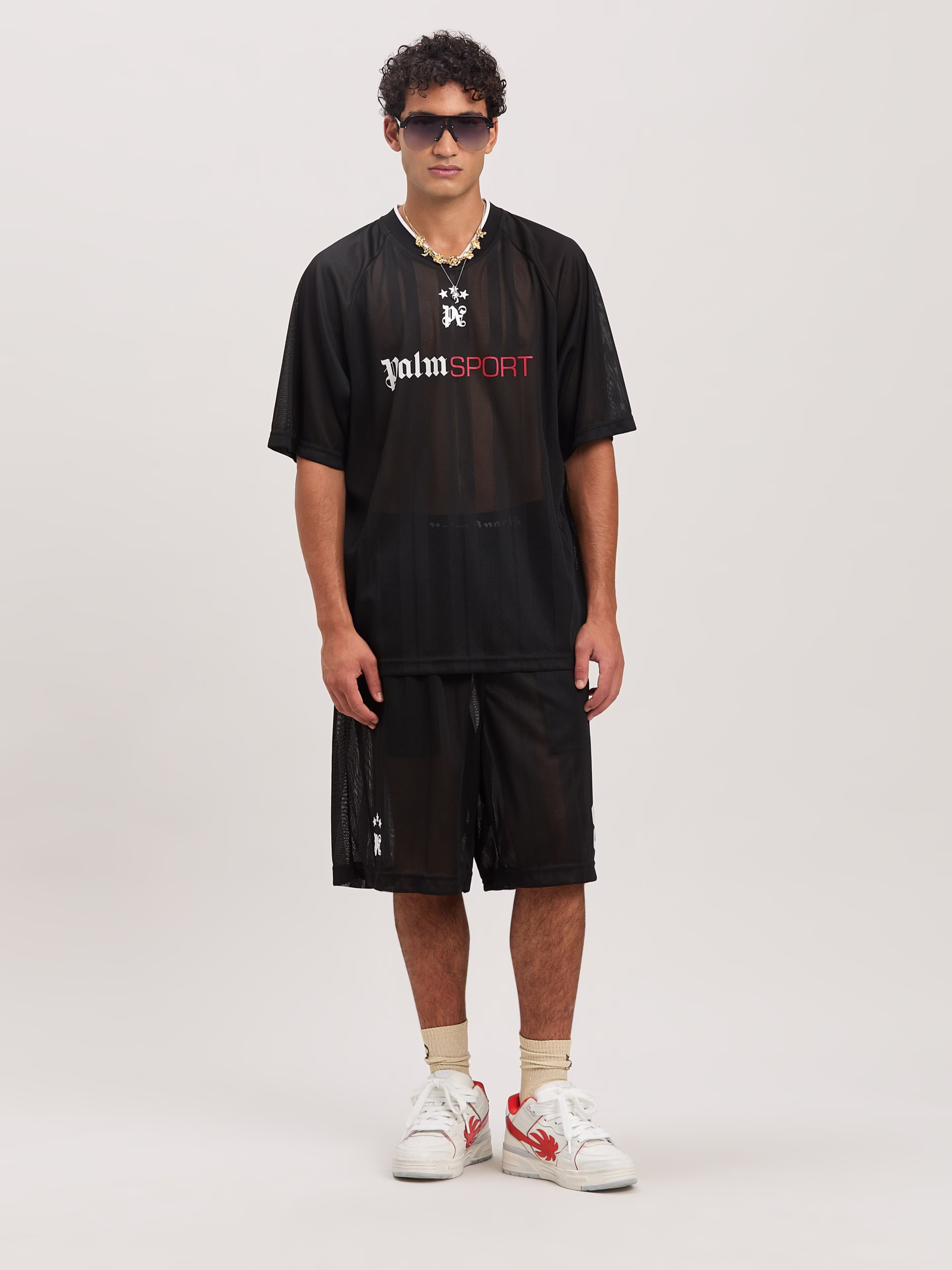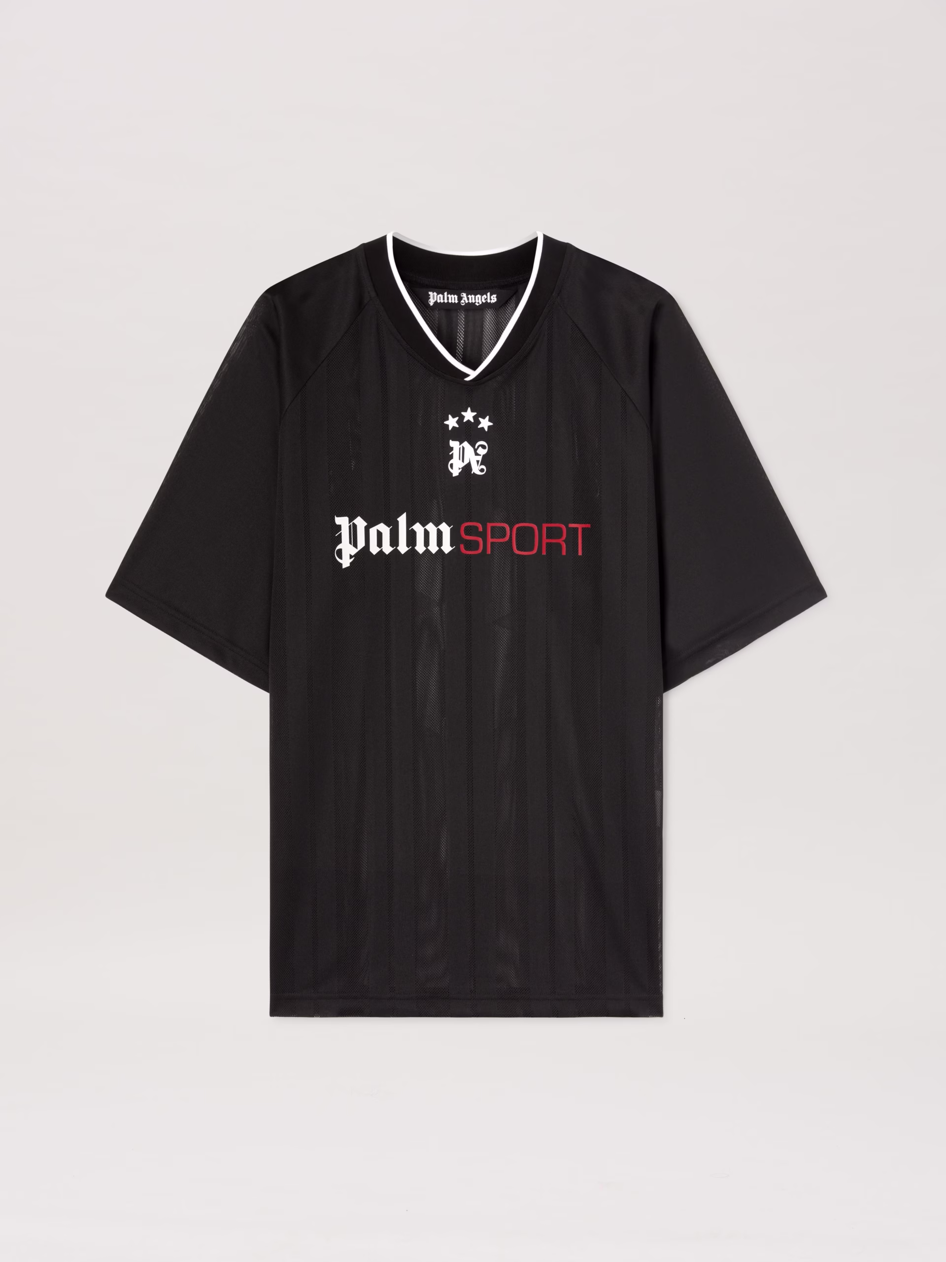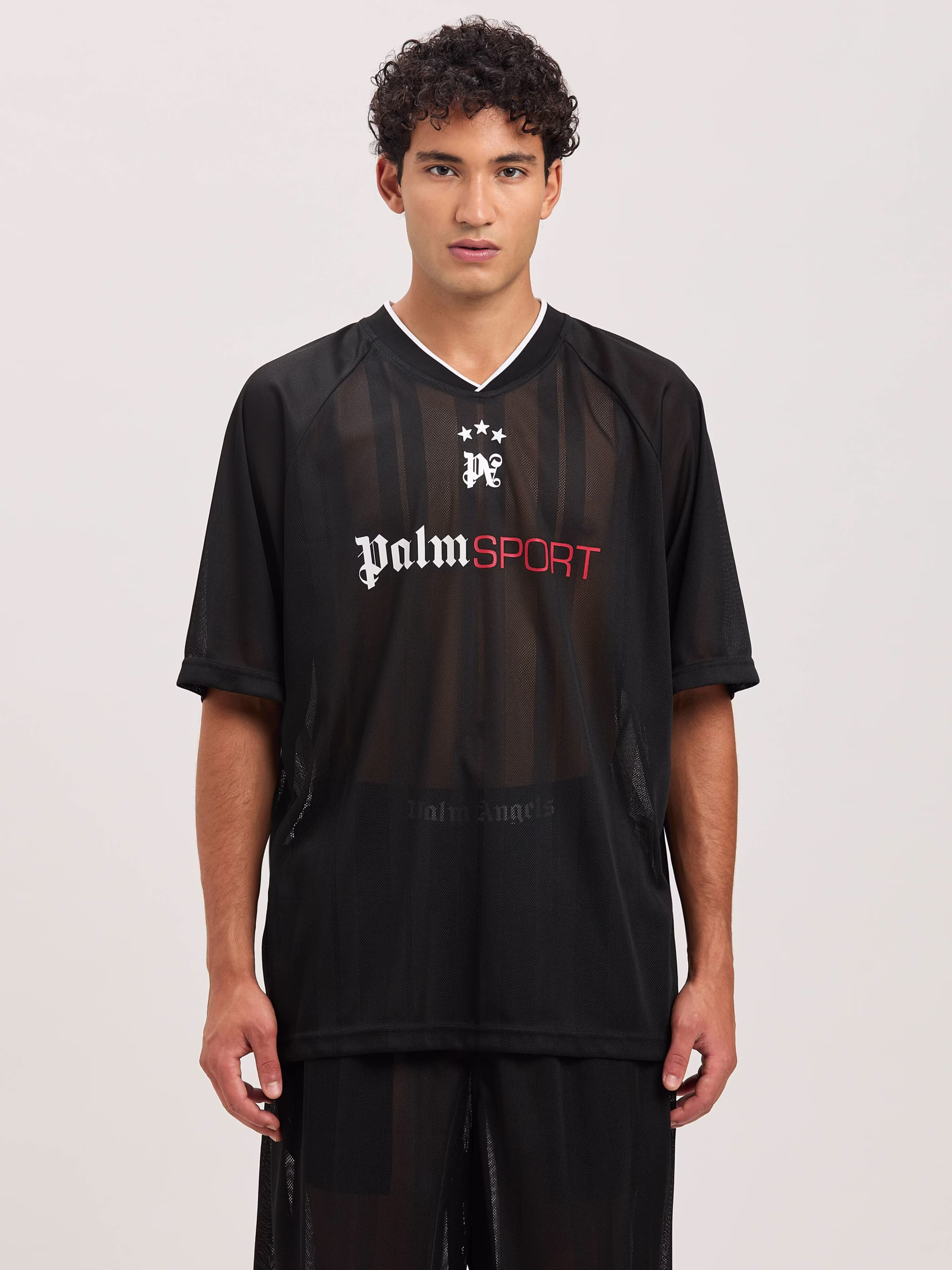 Premiering in SS25 a brand new capsule ispired by sport codes. Men’s black mesh over T-shirt with V-neck, Palm Sport lettering in