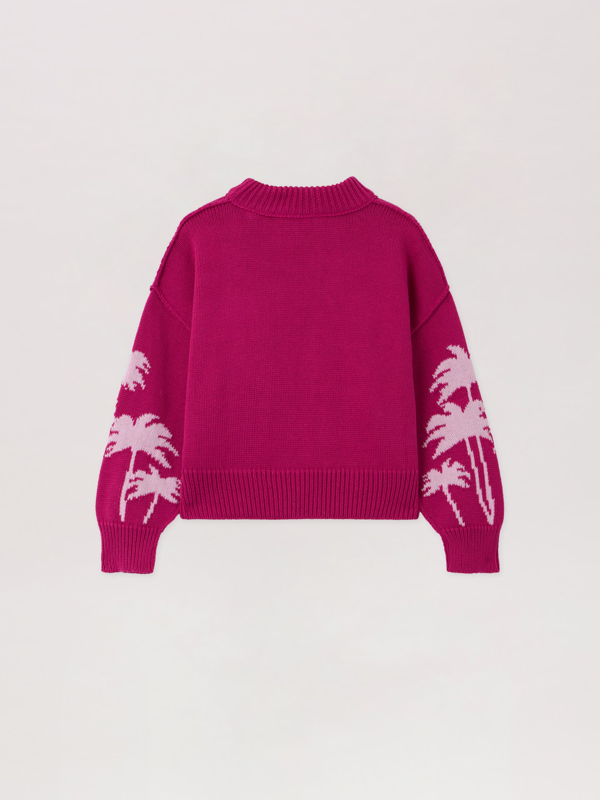 Jacquard knit crew crop sweater featuring palm motifs and ribbed trims. Ideal for a refined streetwear look.