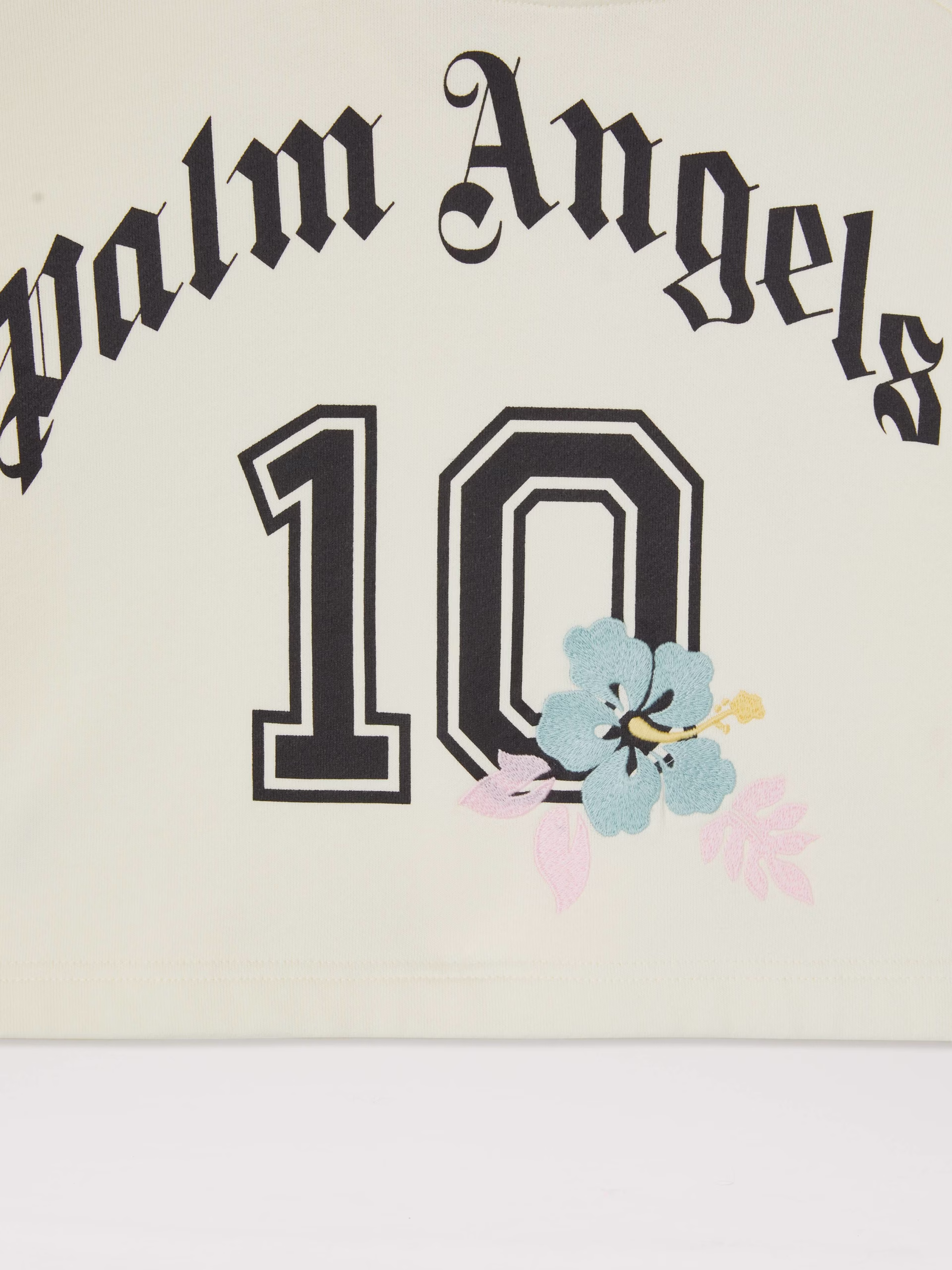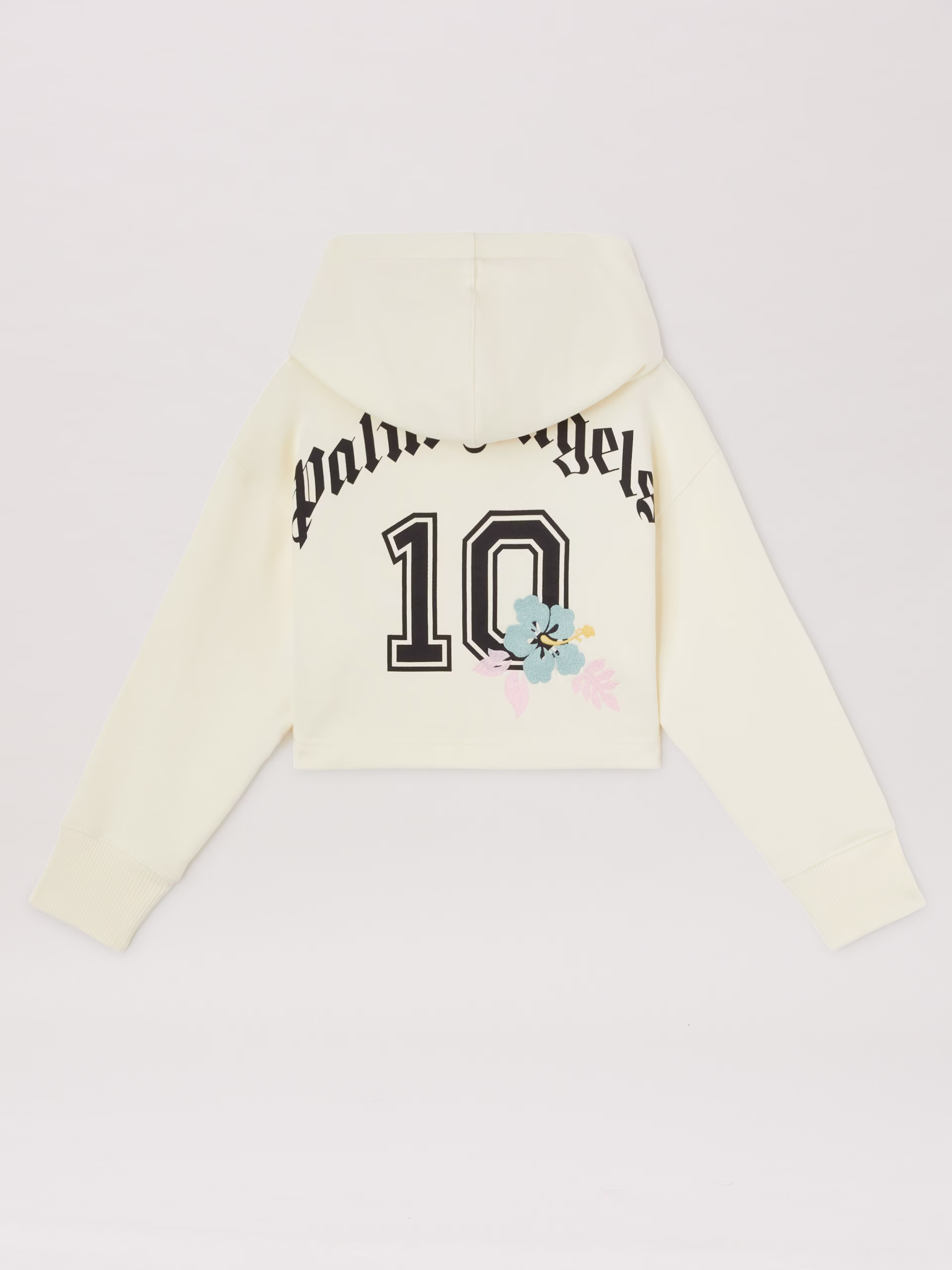 A mix of sporty details and Hawaiian botanicals to create a new team spirit. Girl’s butter color cropped hoodie with Monogram prin