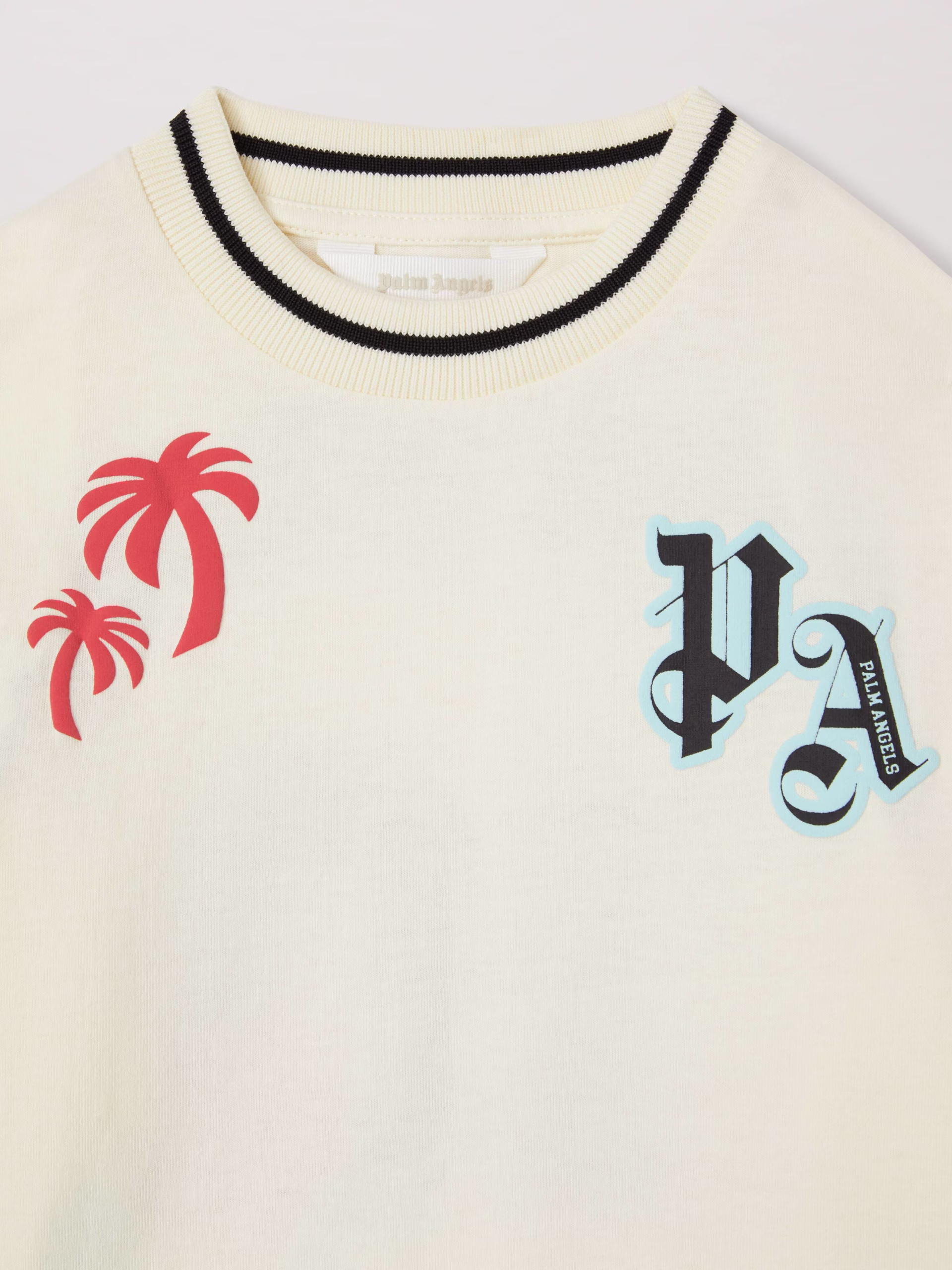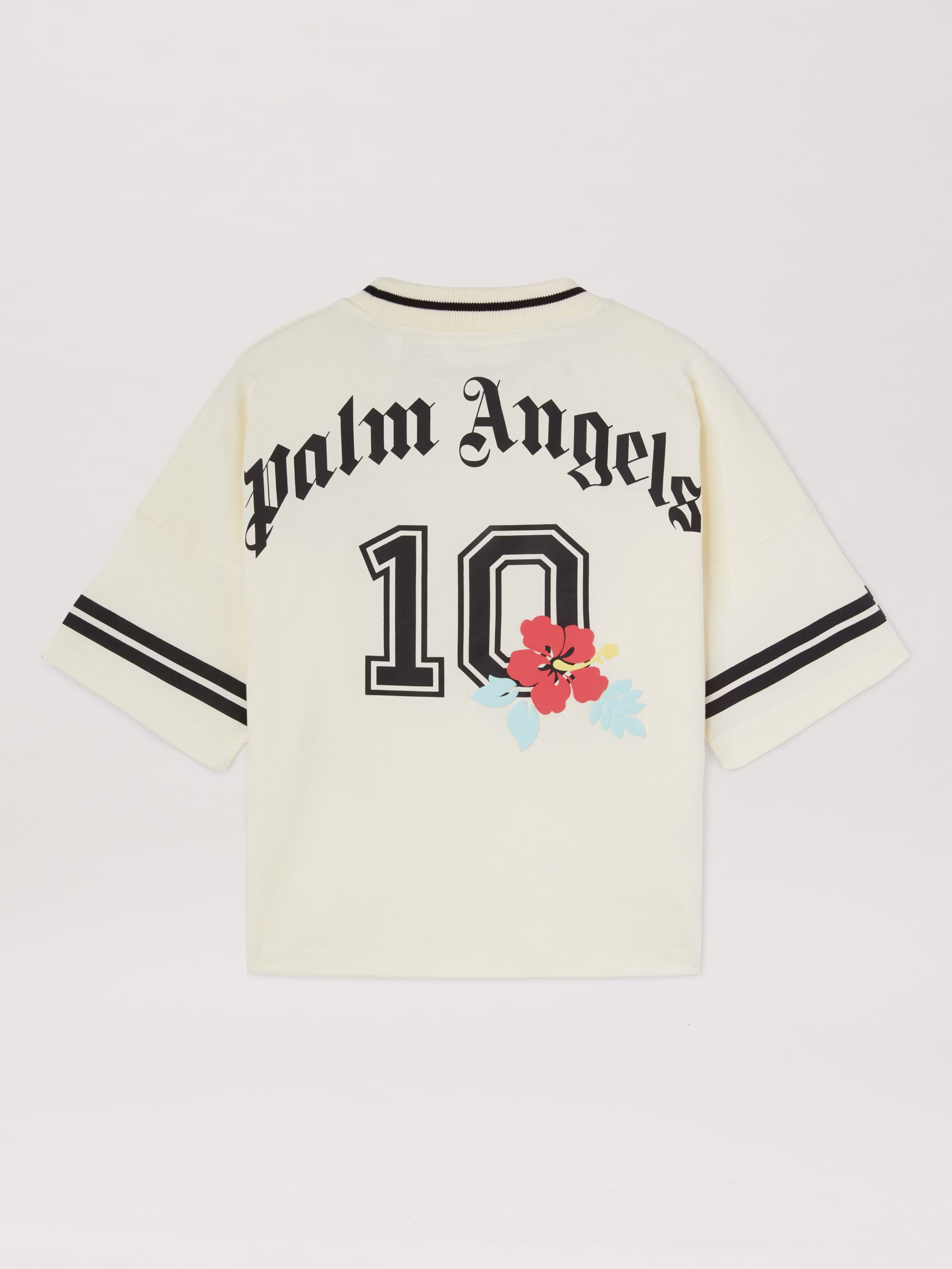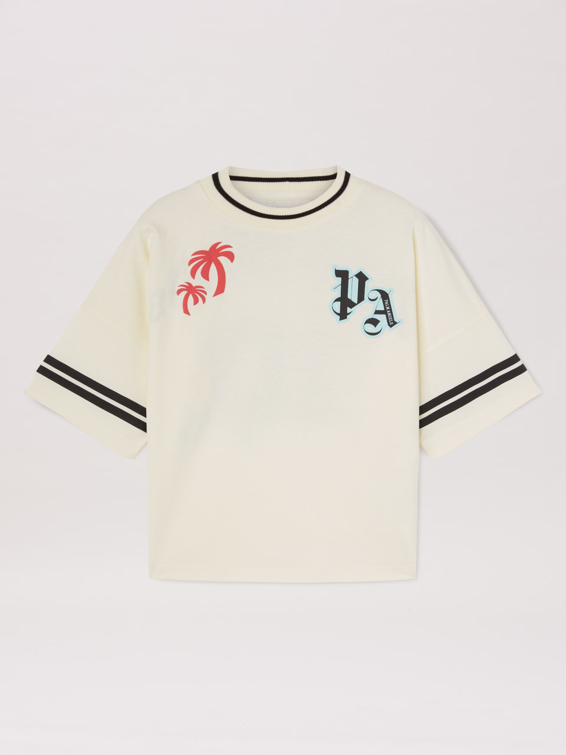 Blending some sporty details with hawaian botanic in a full summer mix. White T-shirt with stripes details on sleeves, Monogram pr