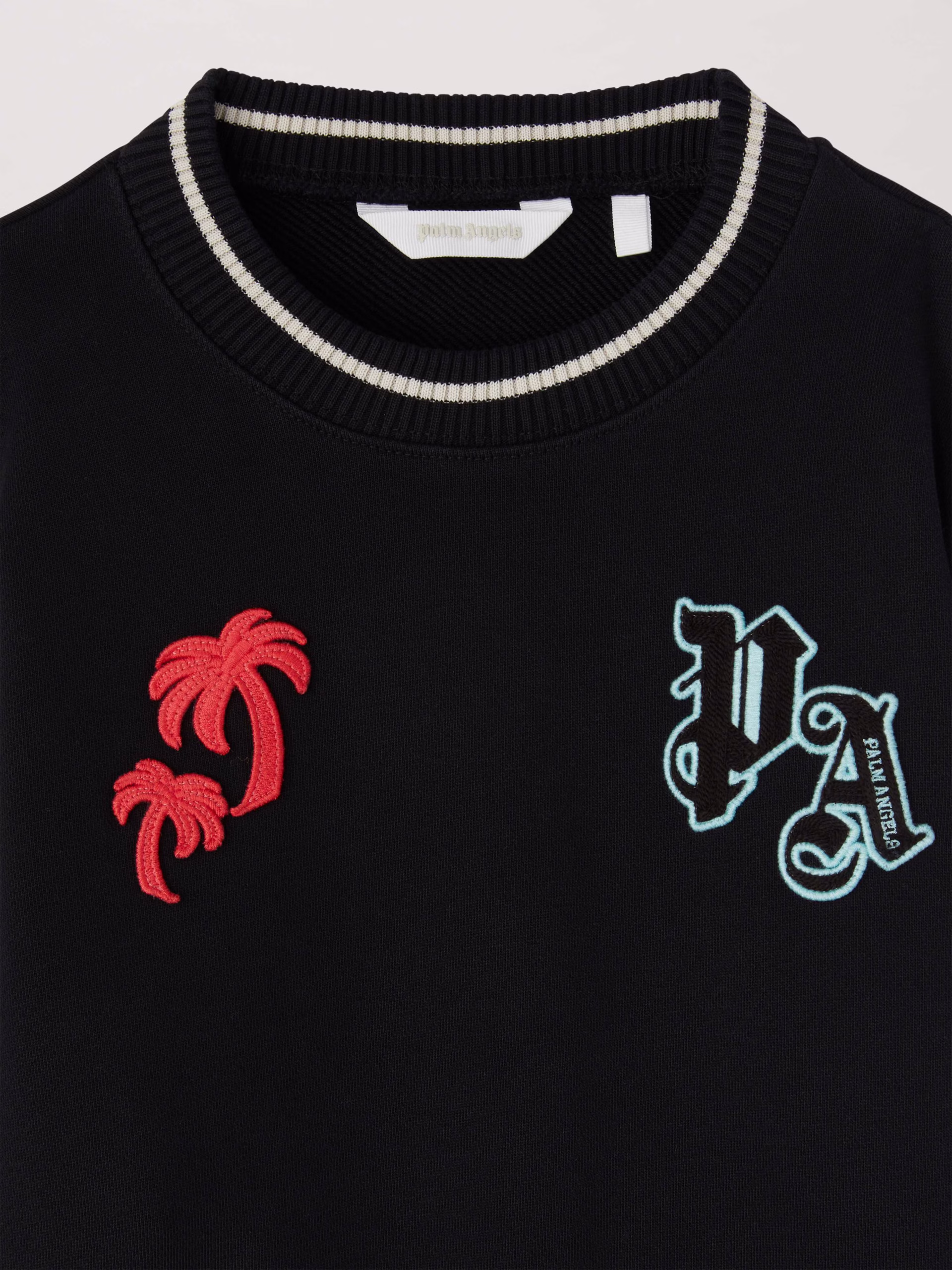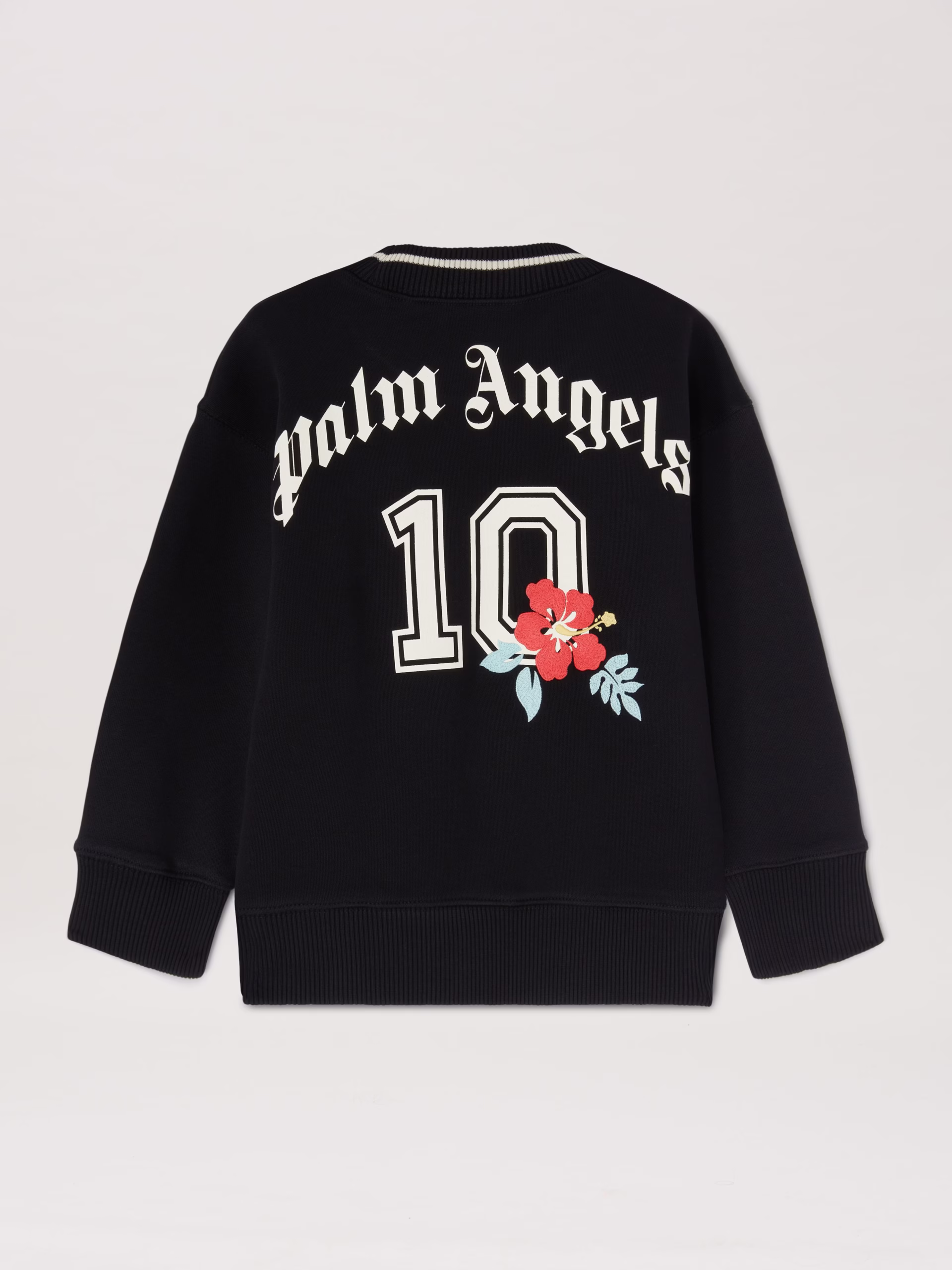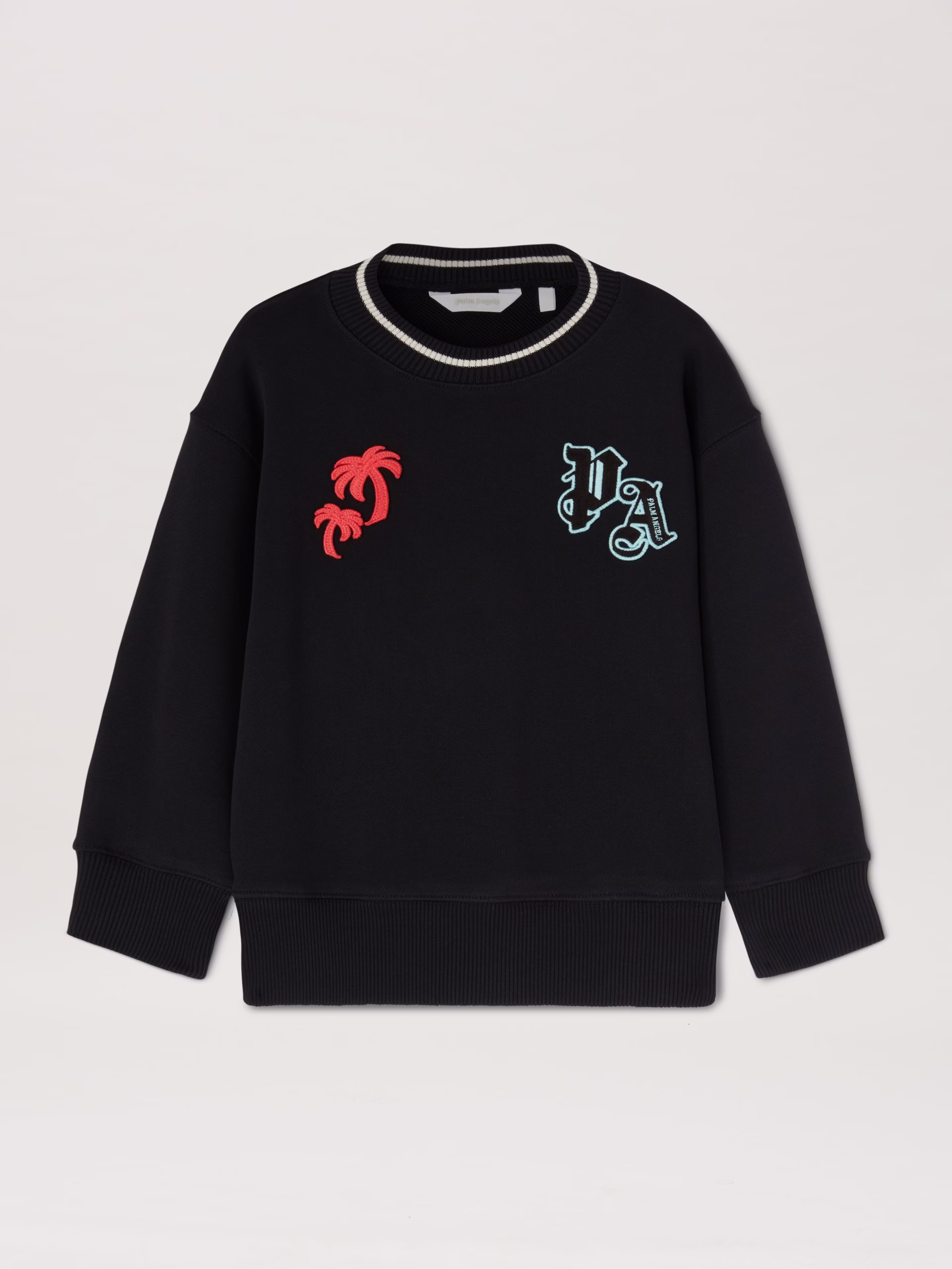 Blending some sporty details with hawaian botanic in a full summer mix. Boy’s black sweatshirt with Monogram printed in white on f