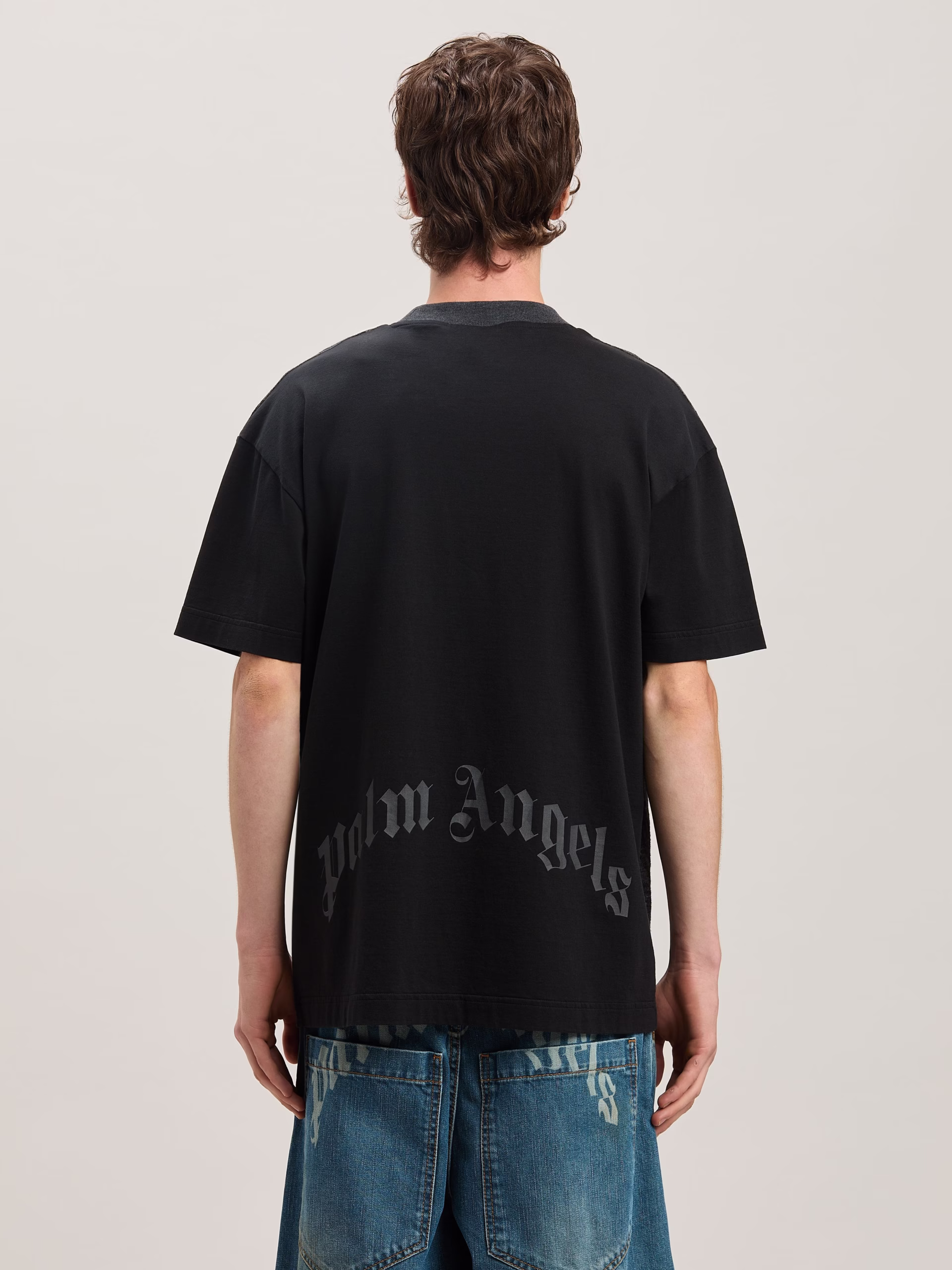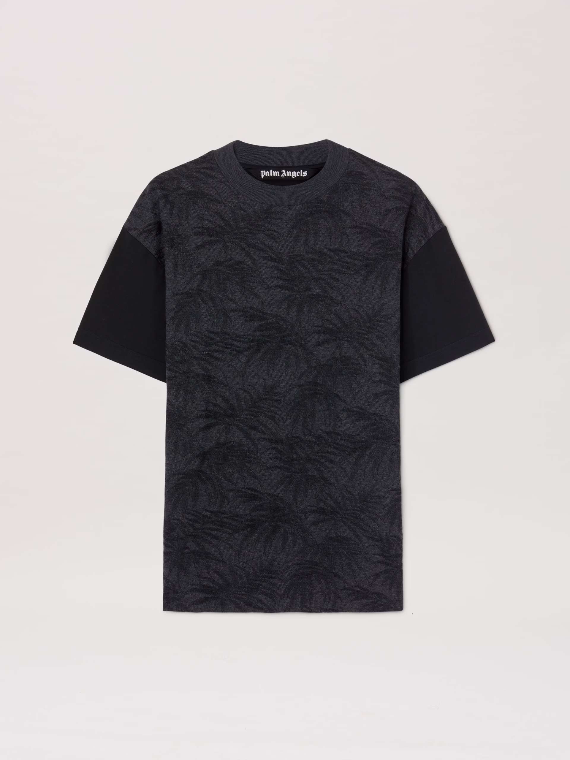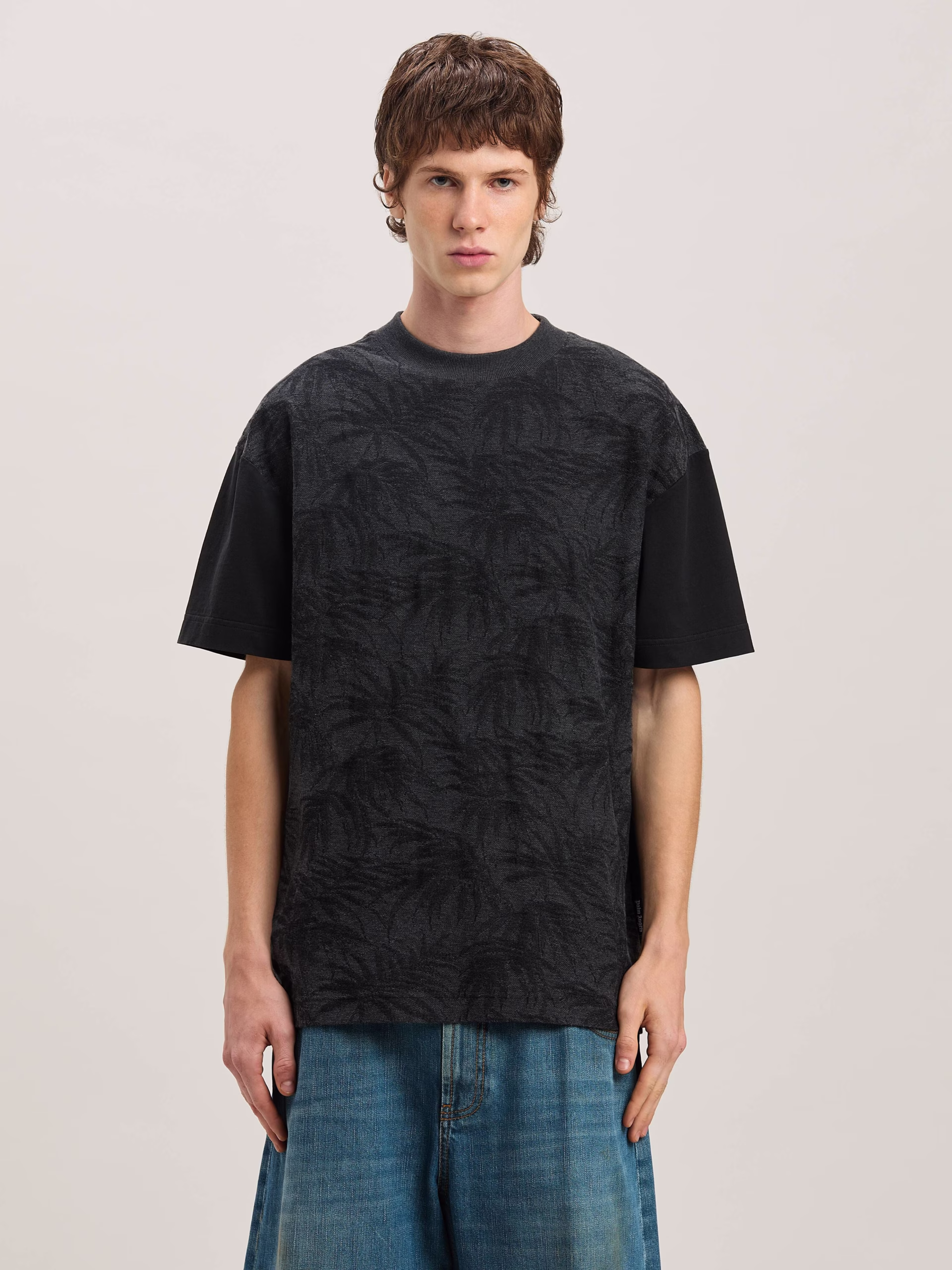 Palm trees blossom in a diversity of styles in the SS25. Men’s black short sleeves T-shirt with all over print of grey palm trees