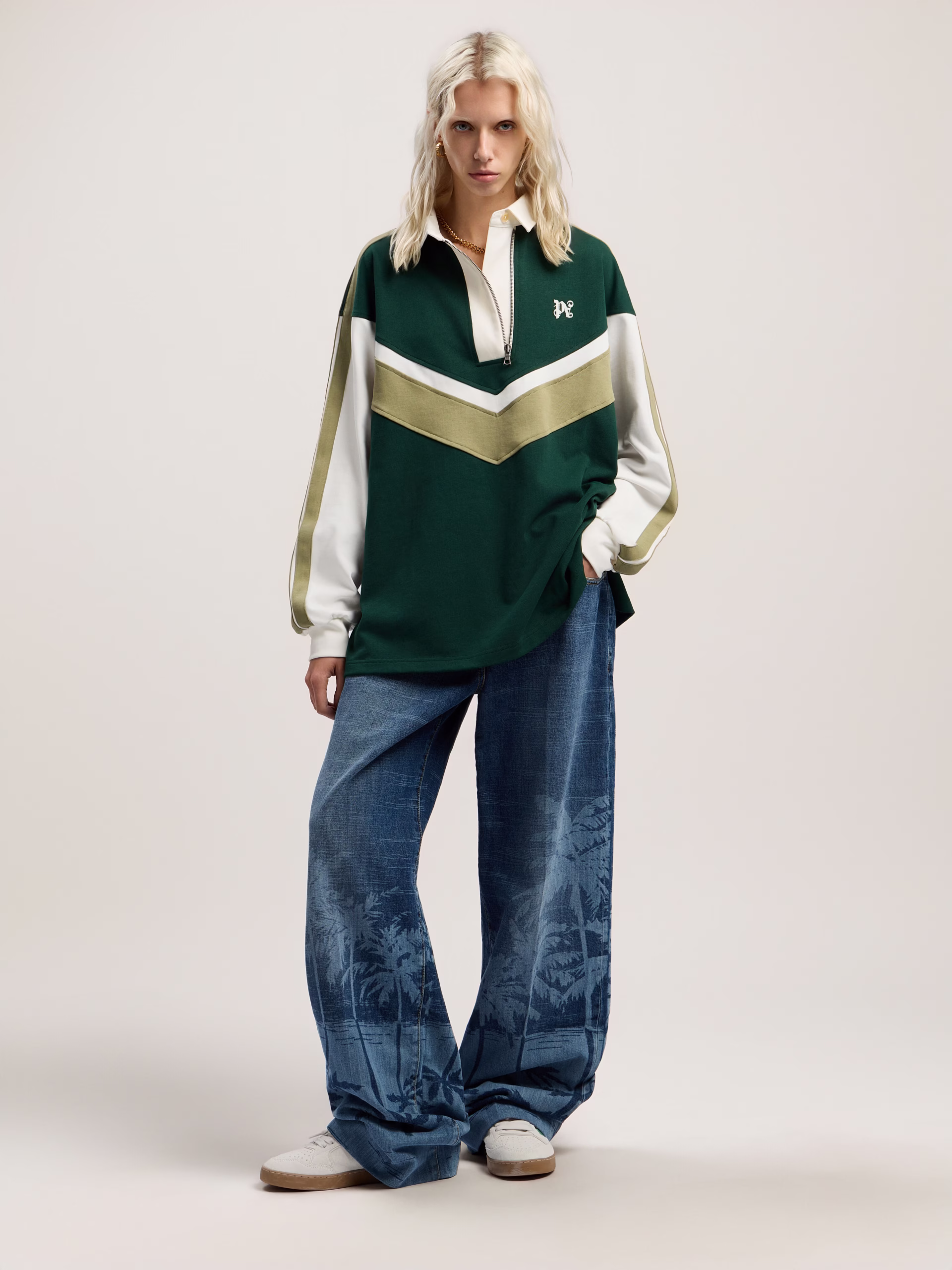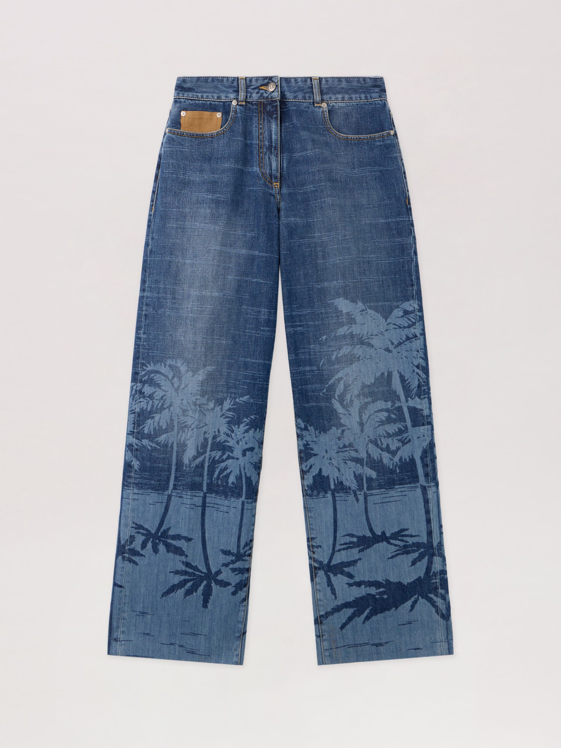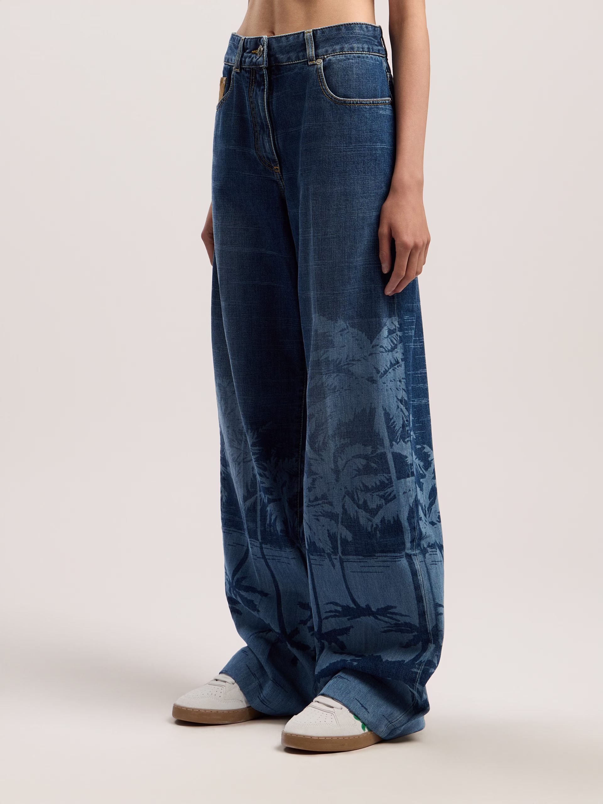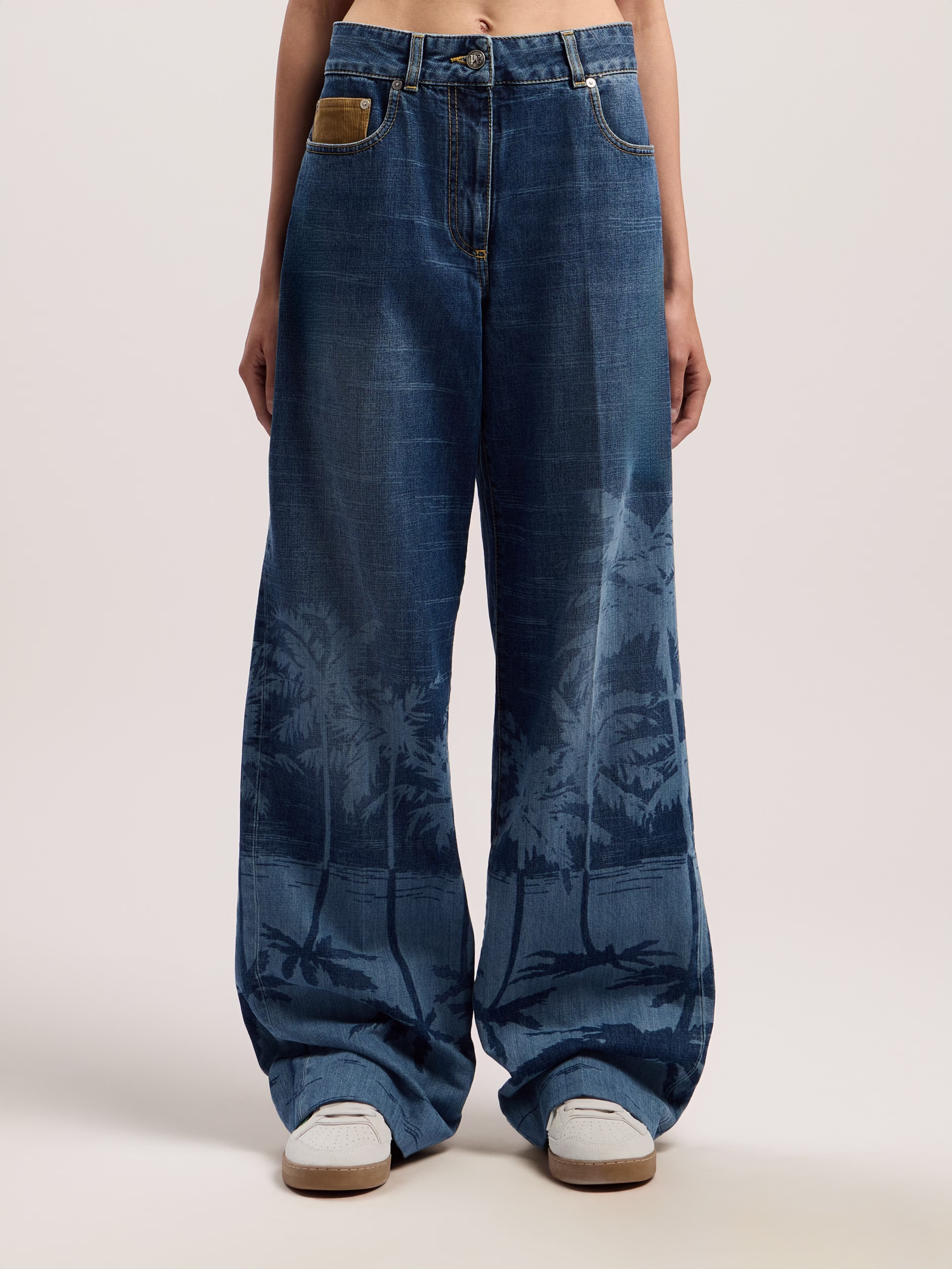 Wide-leg denim pants featuring a relaxed silhouette and palm tree motif, embodying streetwise coolness with a refined edge.