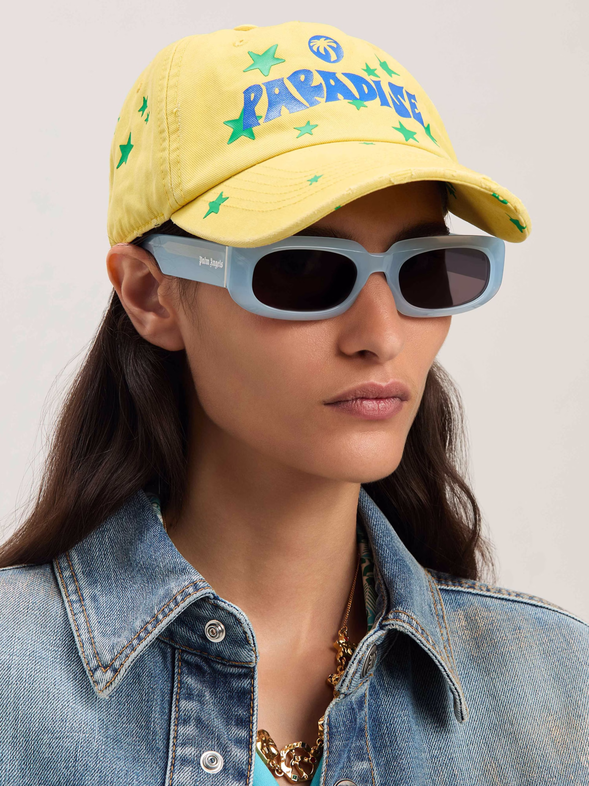 Tropical graphics, glitter details, 3D effects: one of the exclusive prints of SS25. Men’s yellow baseball cap with Paradise lette