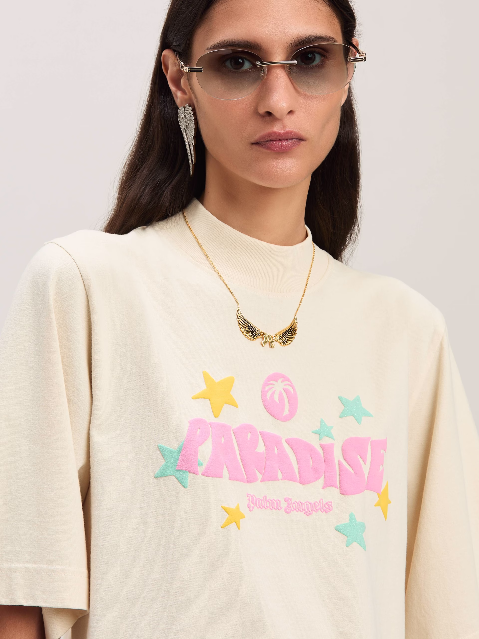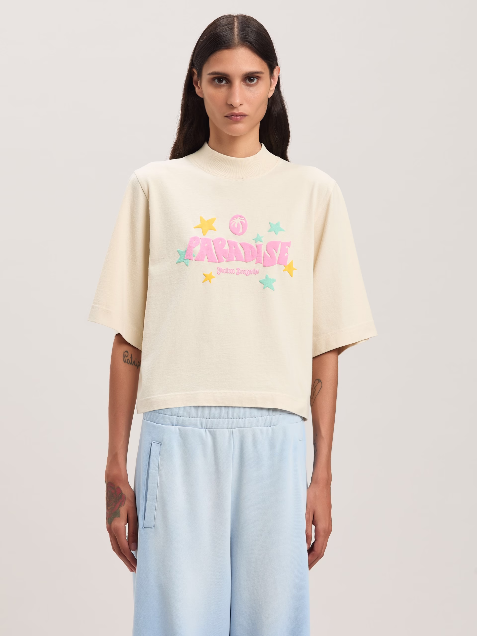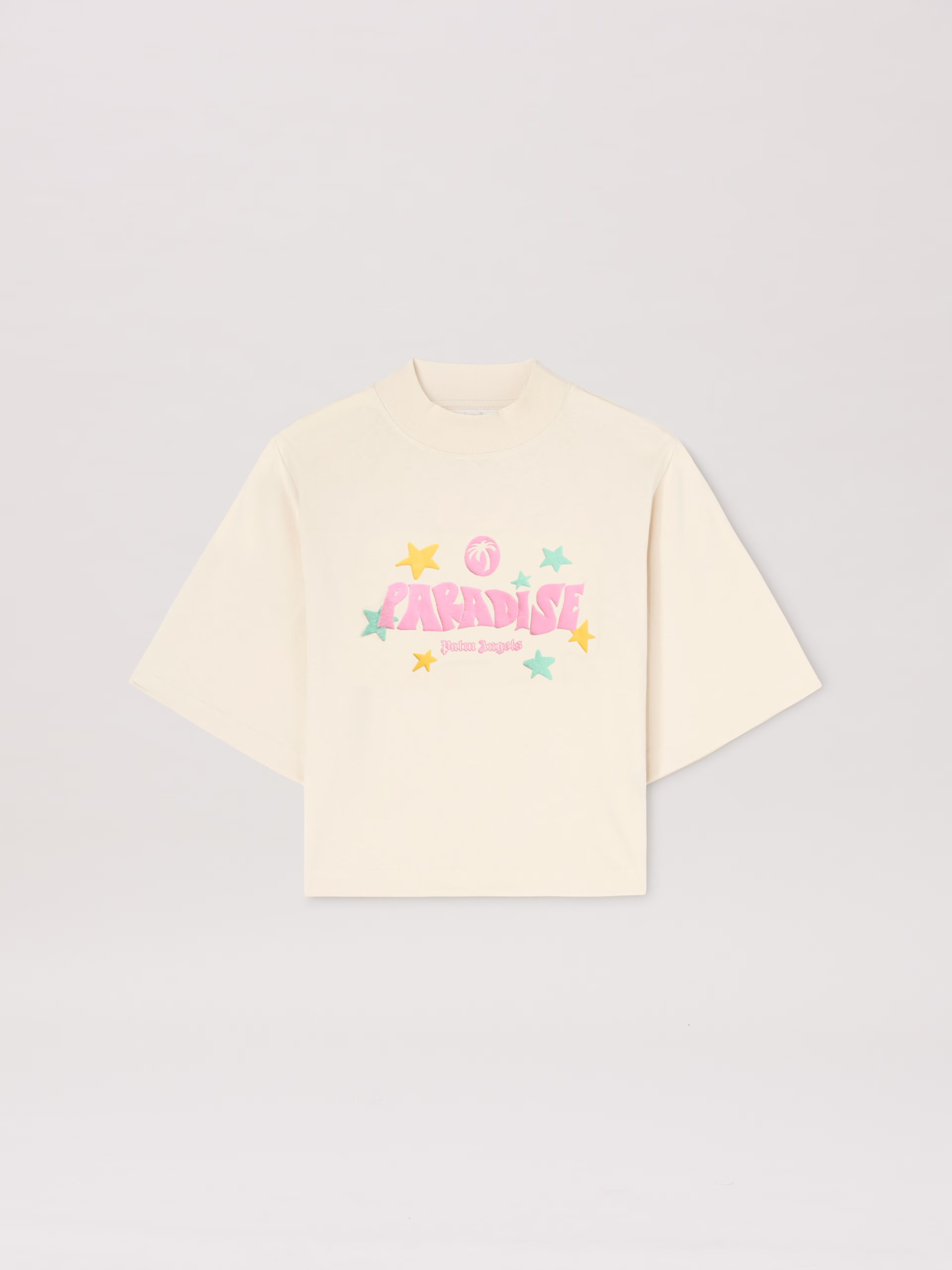 Tropical graphics, glitter details, 3D effects: exclusive SS25 season lettering. Women’s ivory colored cropped T-shirt with Paradi