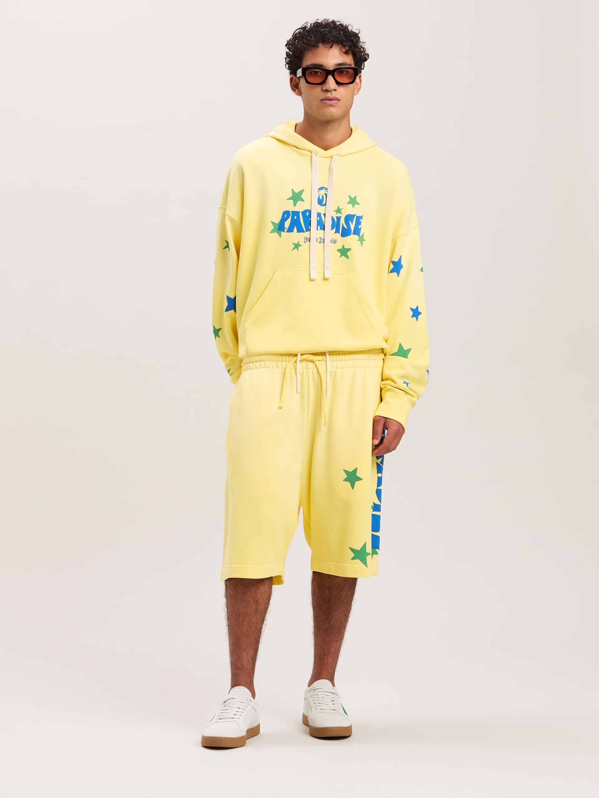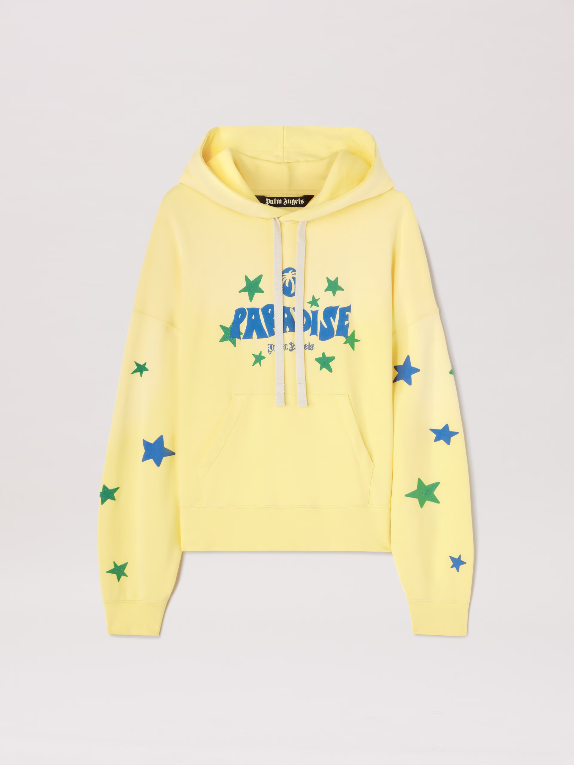 Tropical graphics, glitter details, 3D effects: one of the exclusive prints of SS25. Men’s yellow hoodie with Paradise lettering i