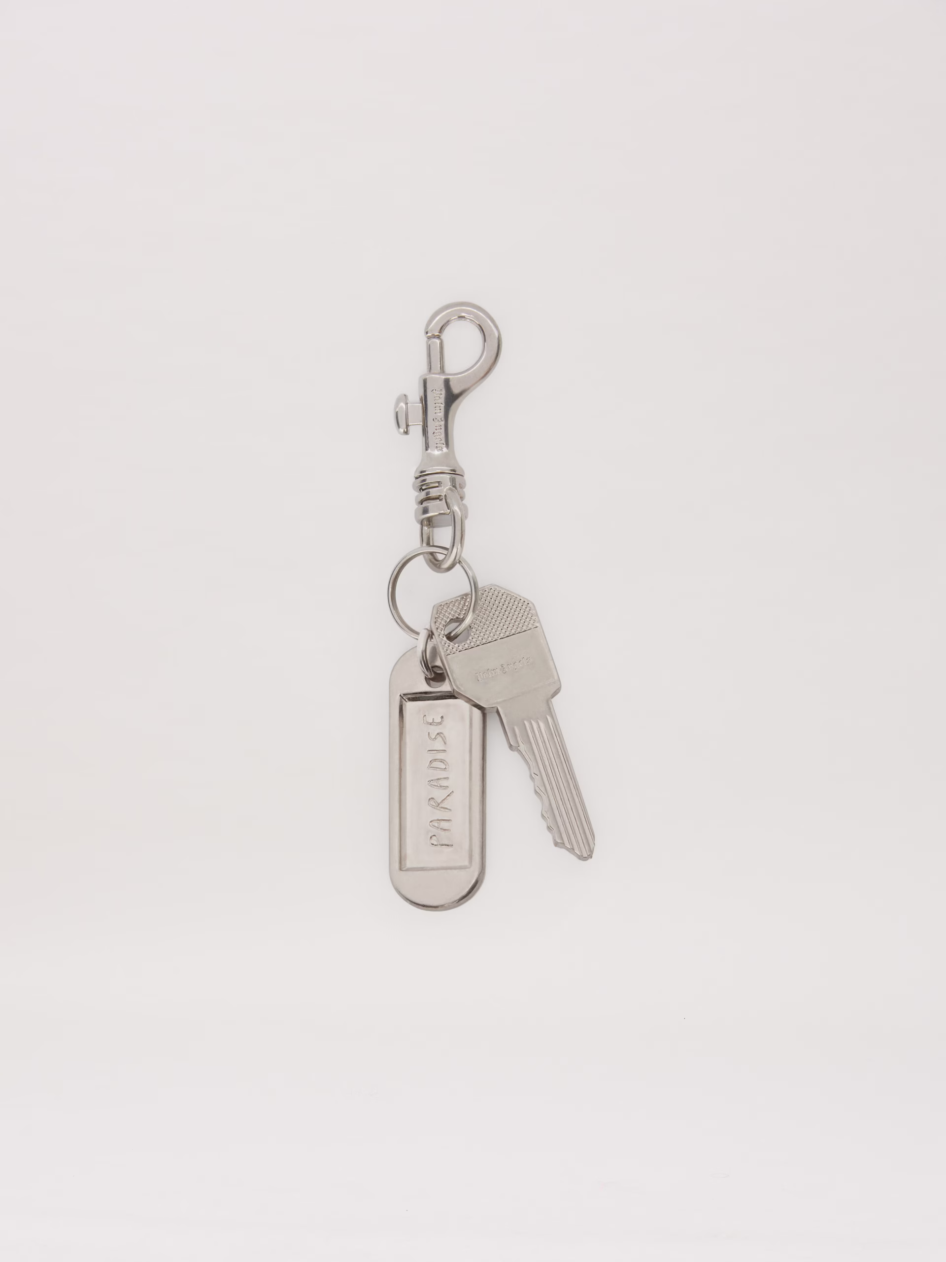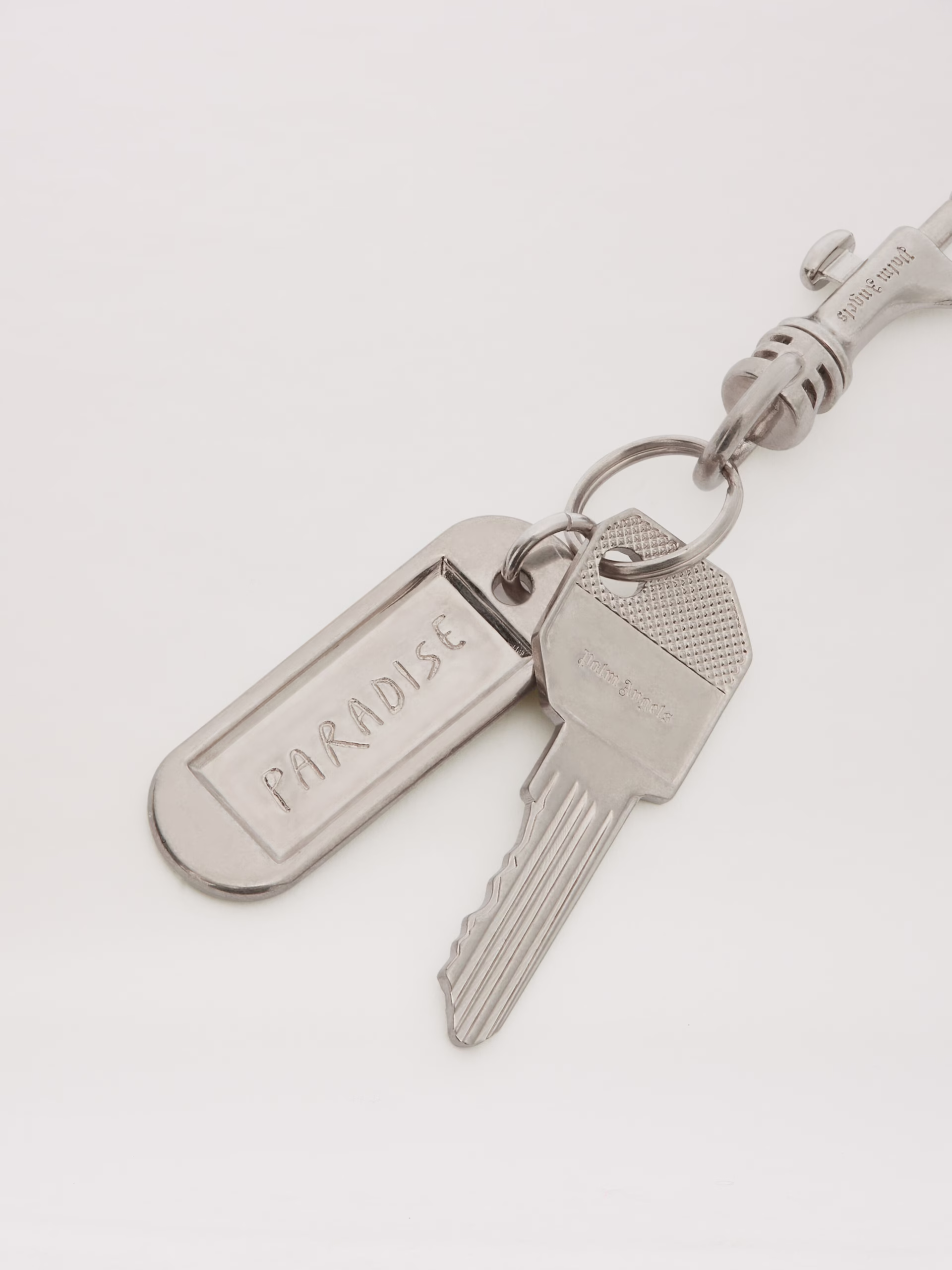Metallic hardwear as a unifying element among accessories. Men’s key ring with snap hook and silver plate with logo embossed.