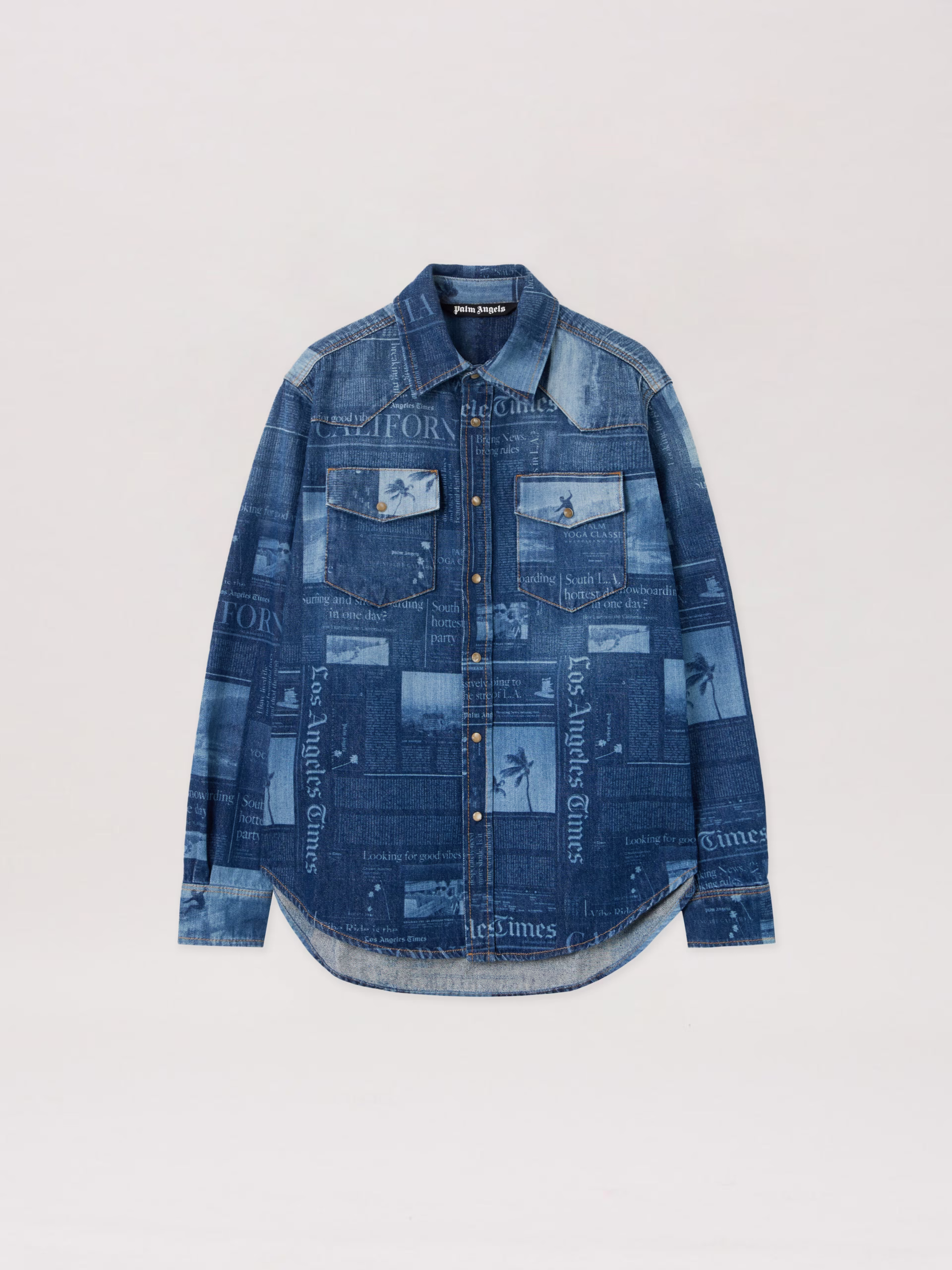 This distinctive denim shirt showcases an all-over newspaper print, embodying a bold fusion of street style and refined edge.