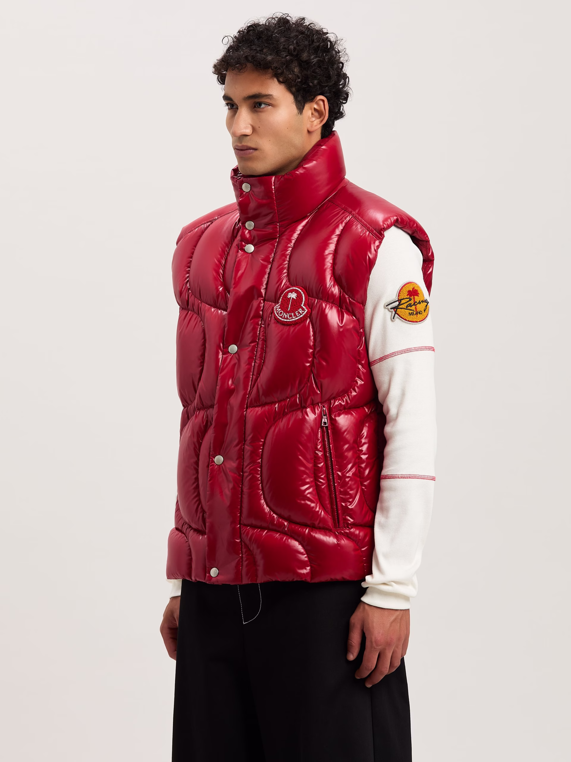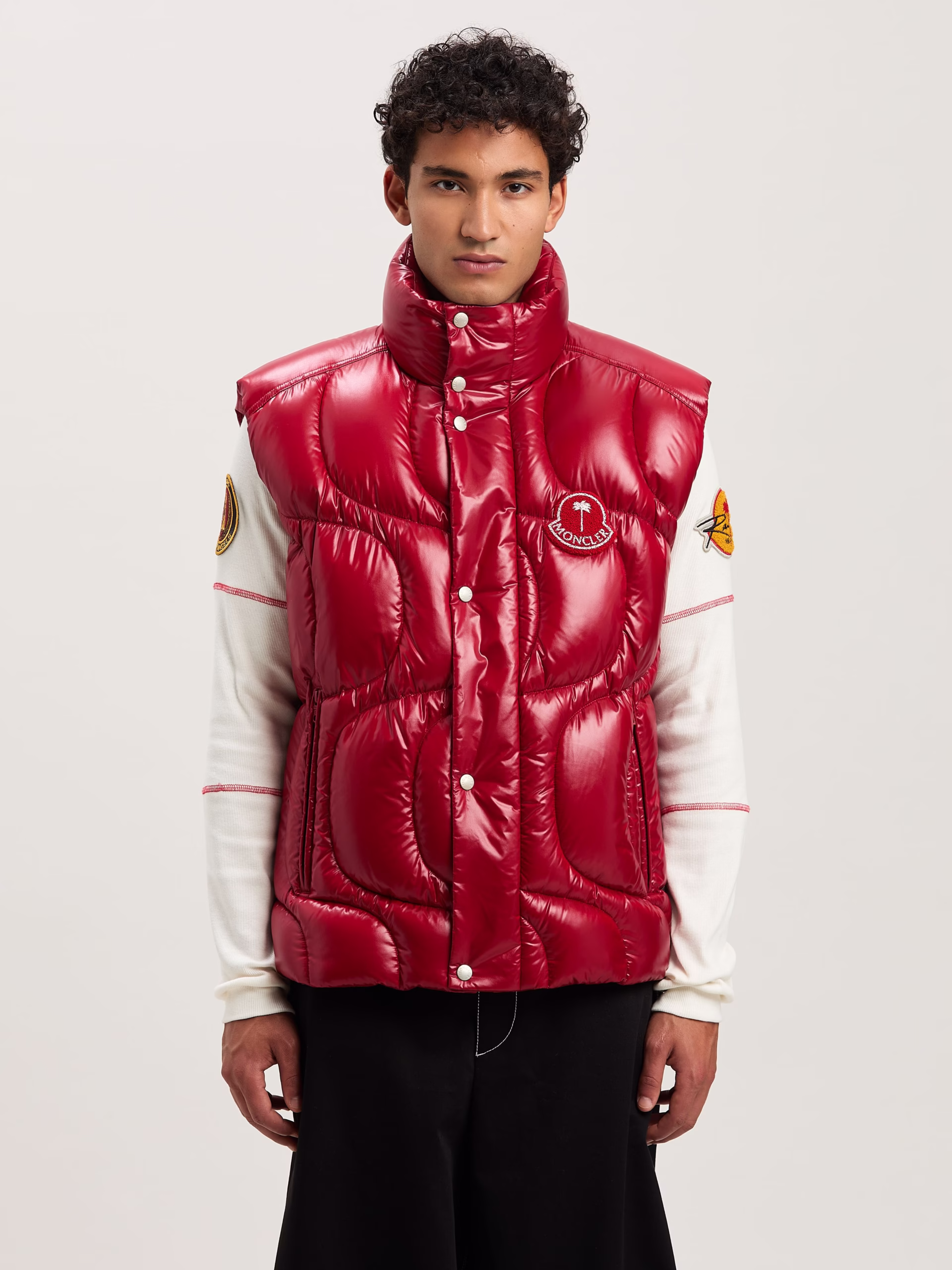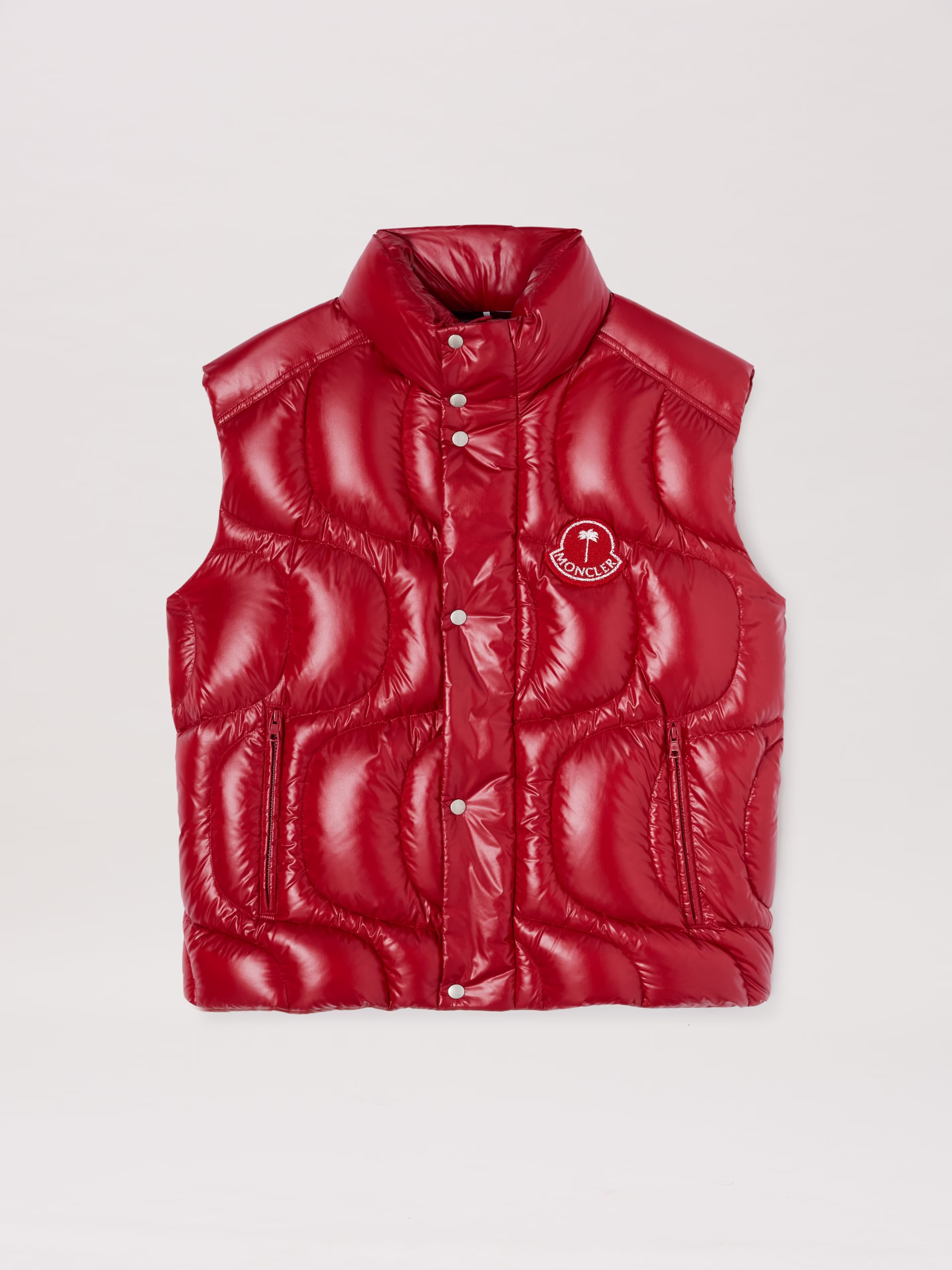 Red down vest in lacquered nylon with wave stitching, red terry patch with palm tree and Moncler logo in white on front and white