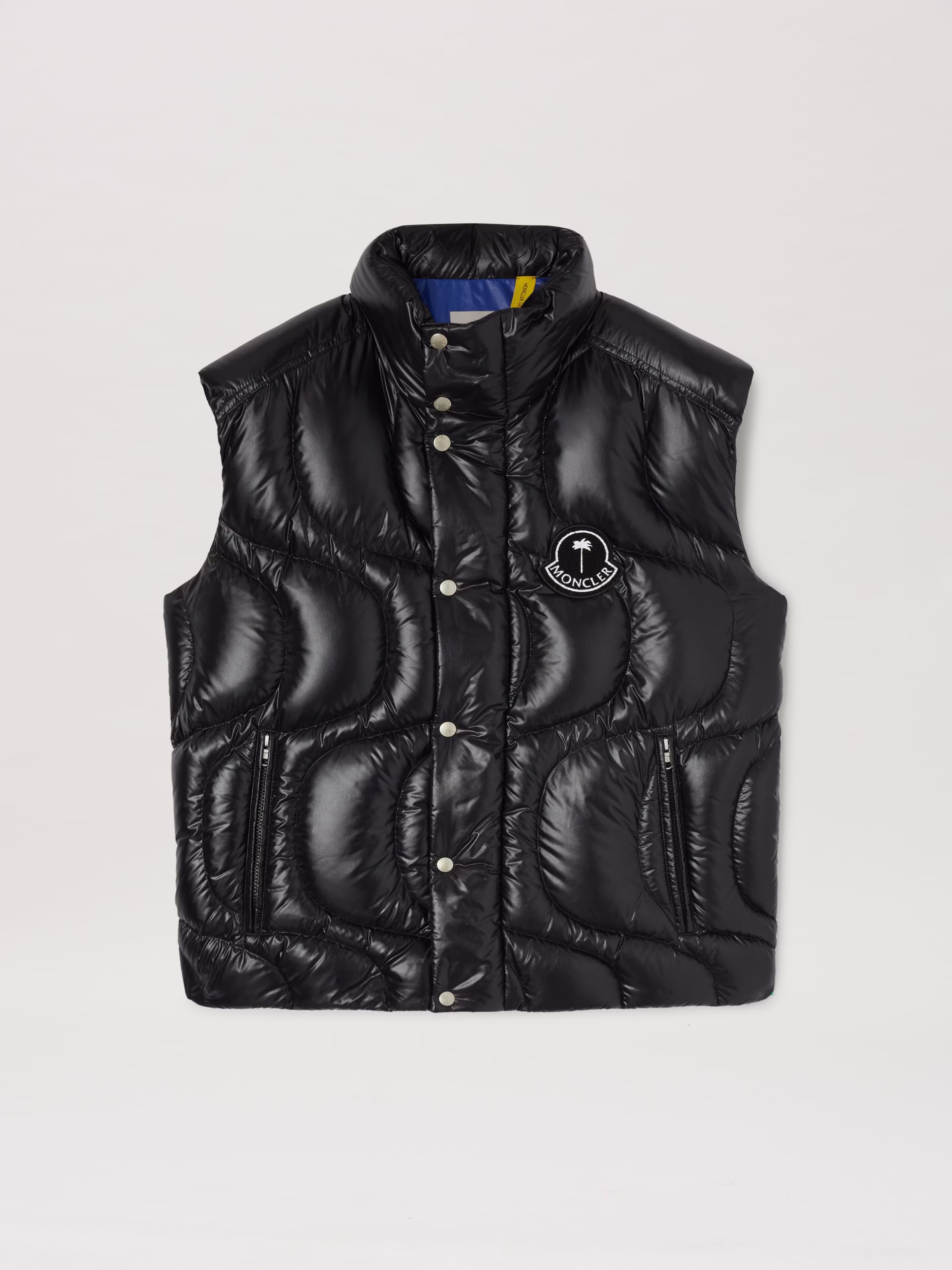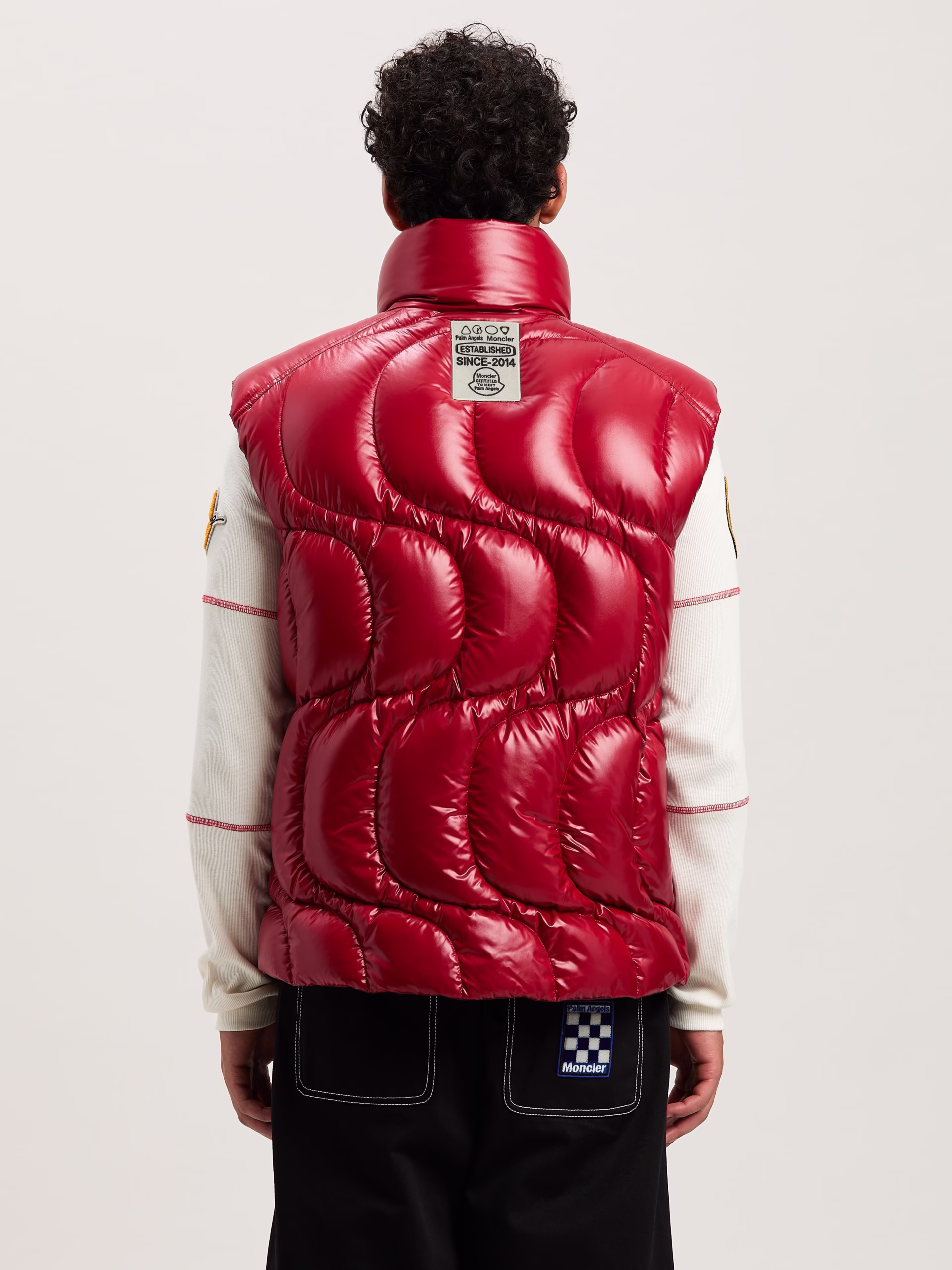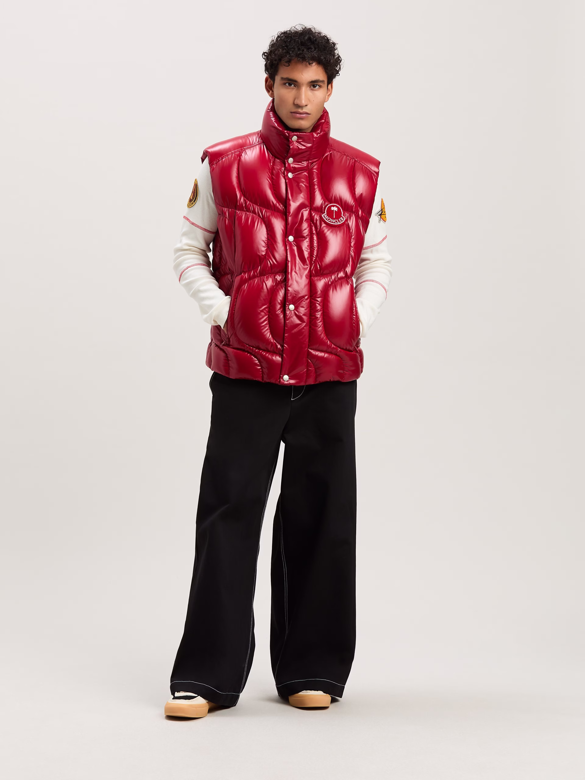 Red down vest in lacquered nylon with wave stitching, red terry patch with palm tree and Moncler logo in white on front and white