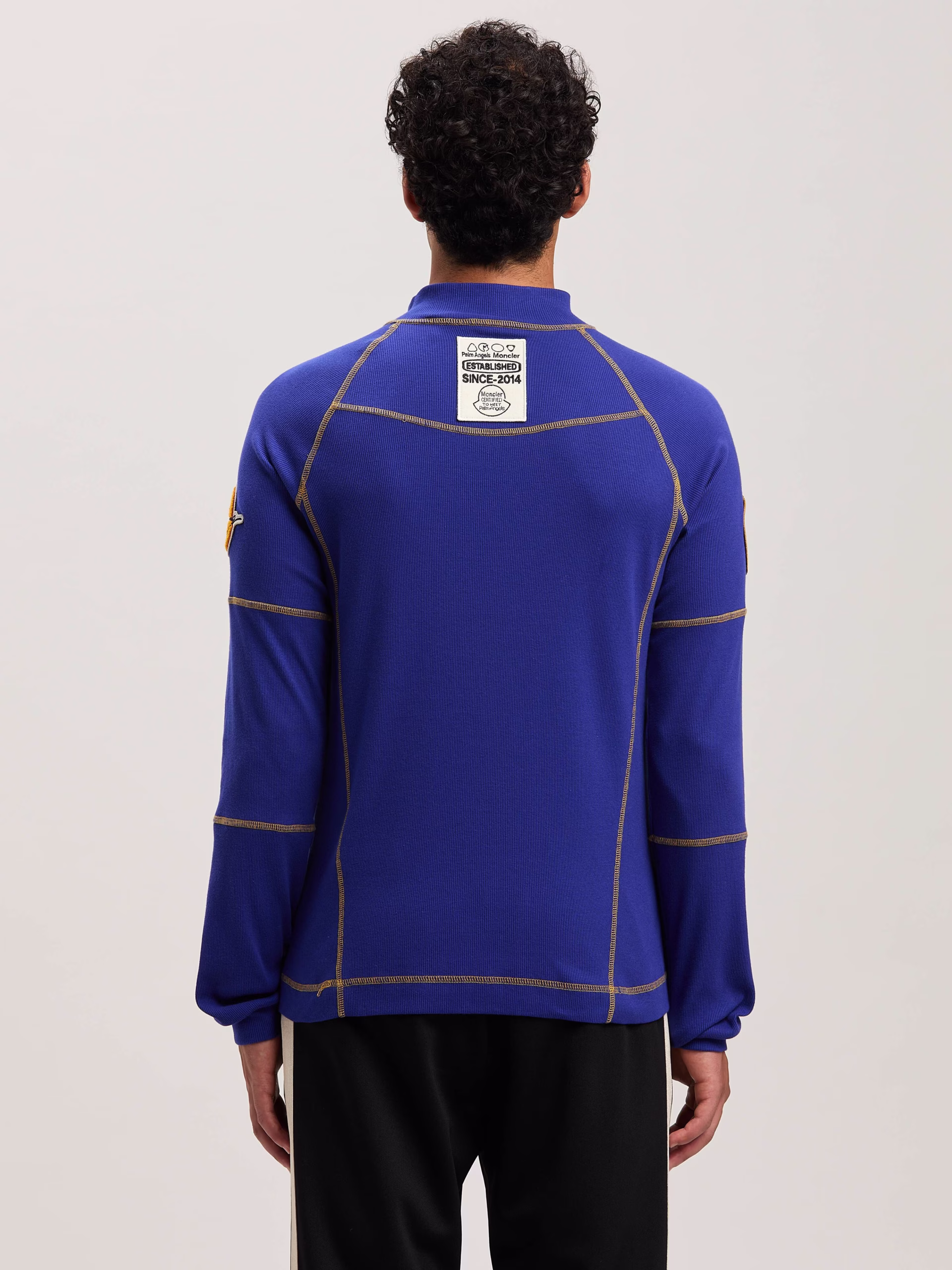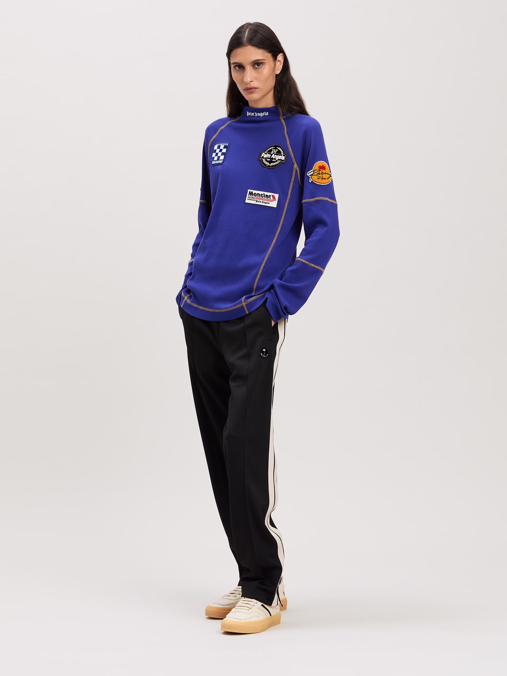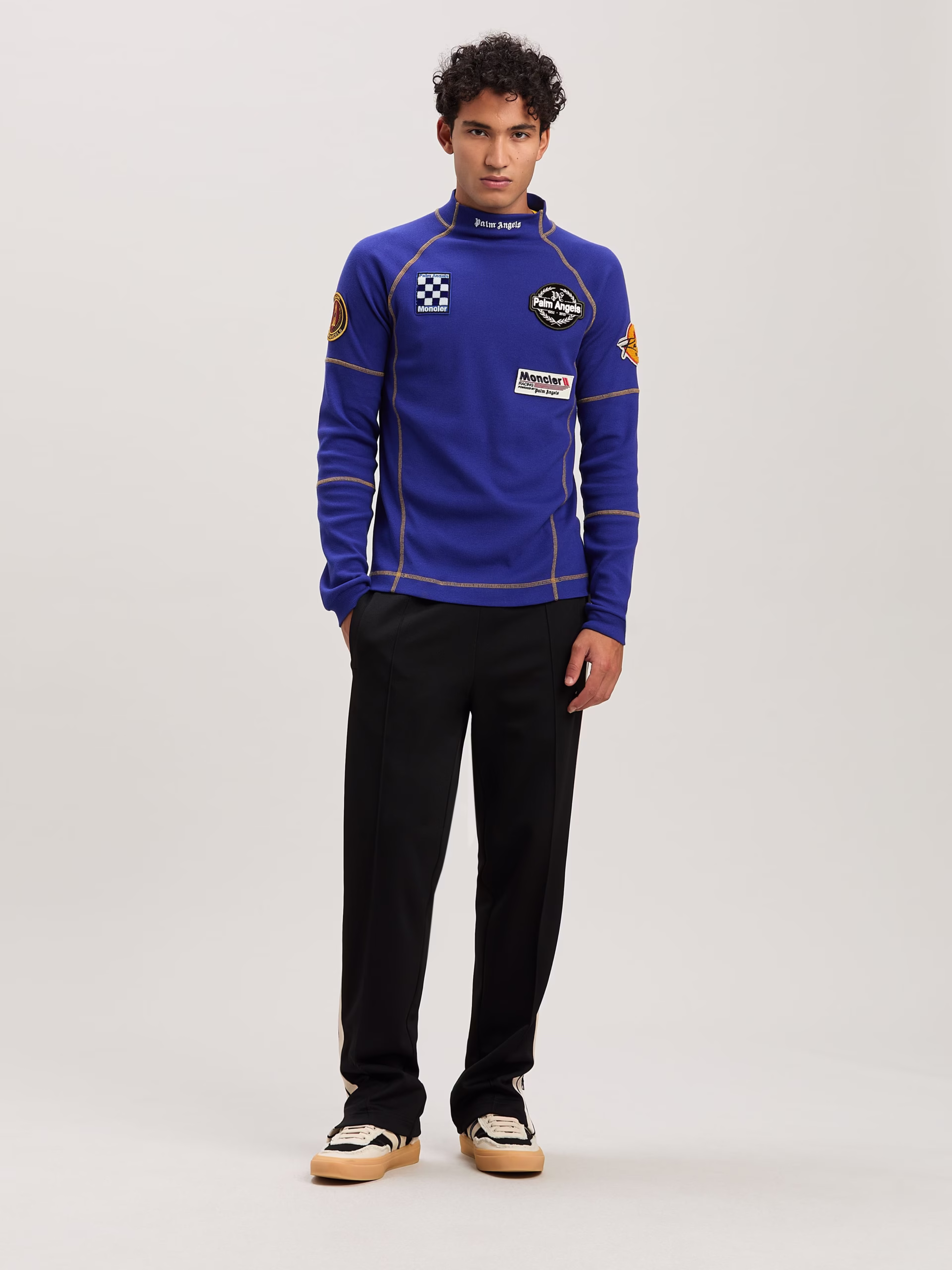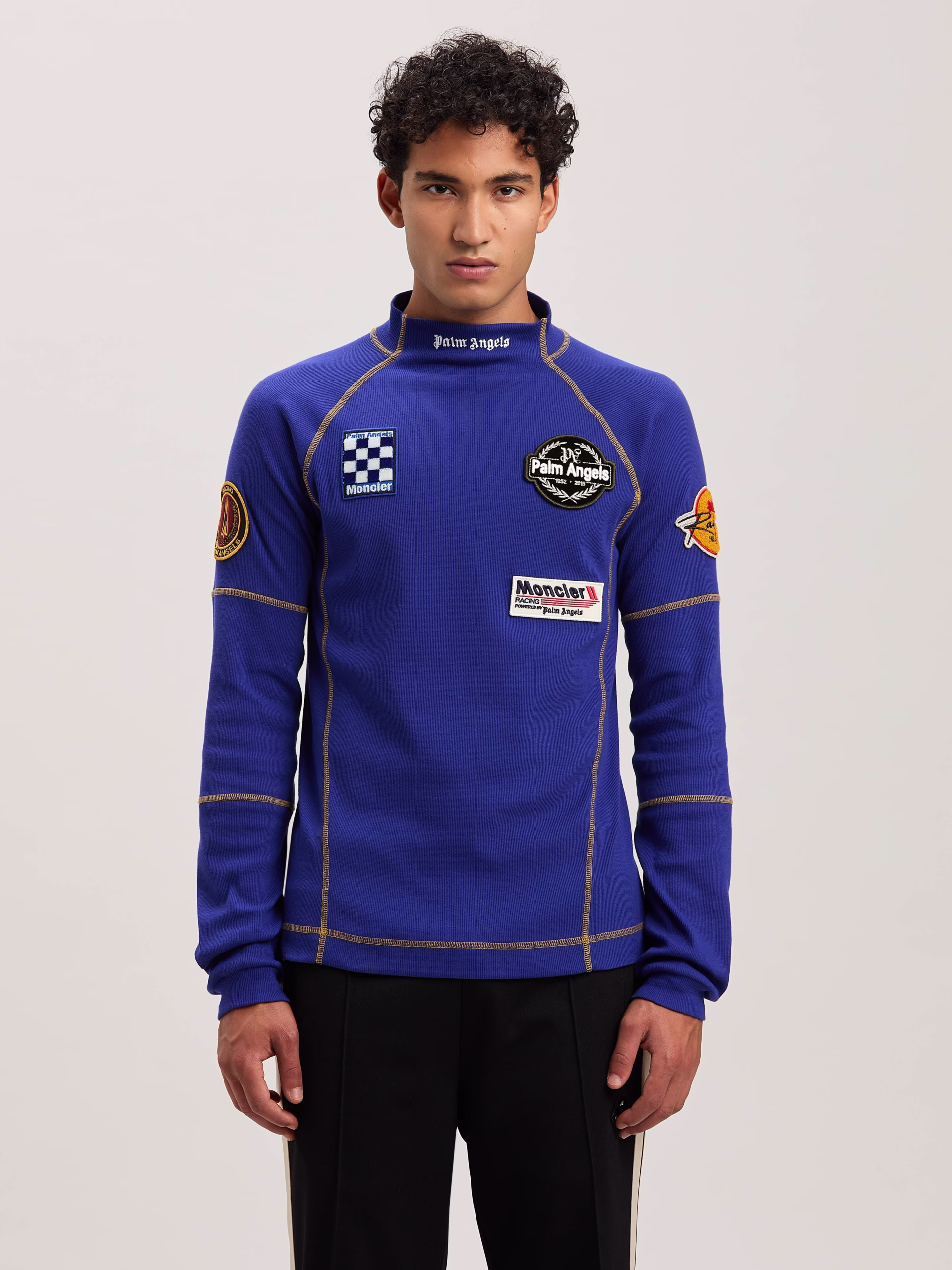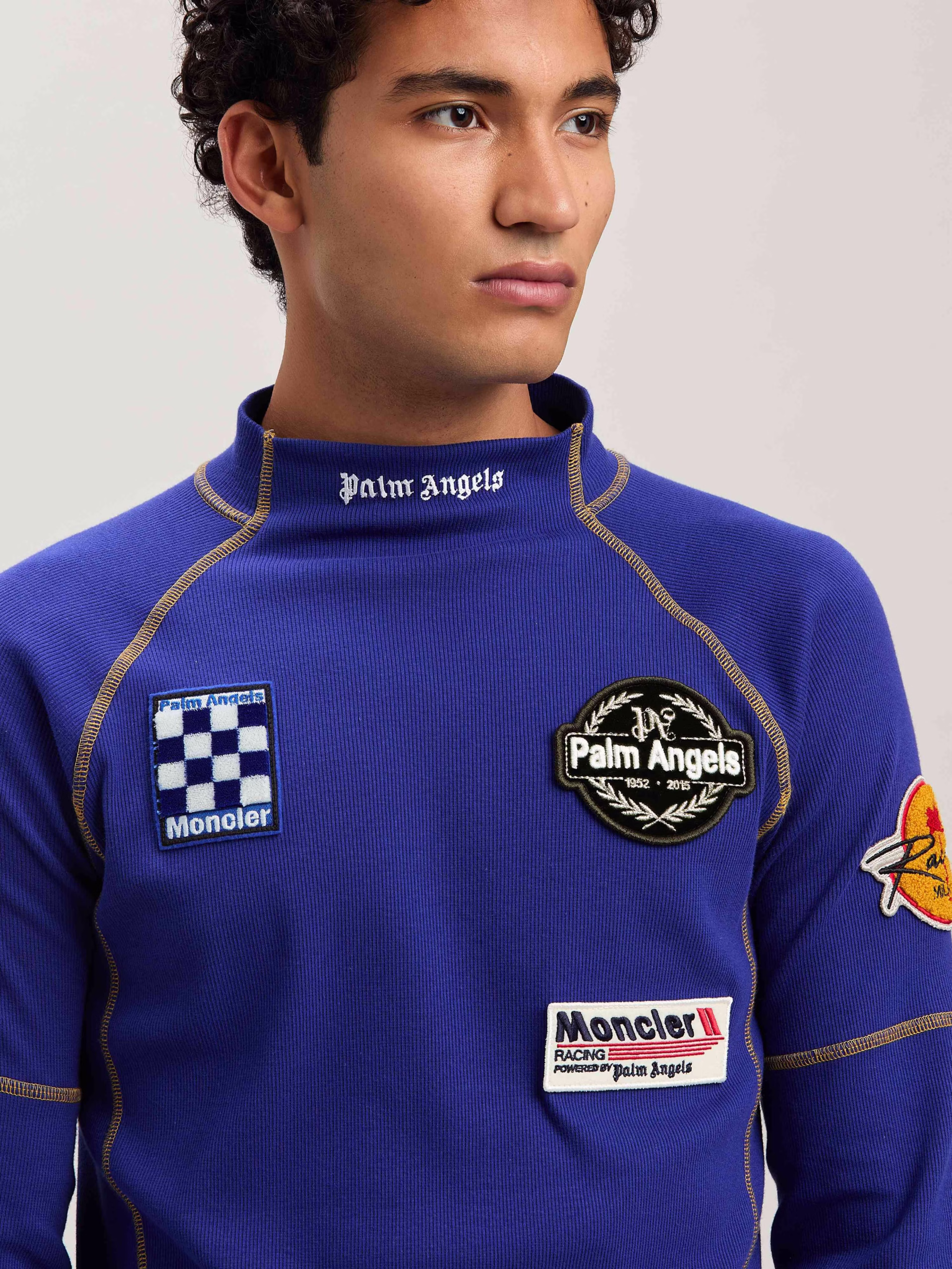Blue ribbed turtleneck with long sleeves, with Palm Angels logo embroidered in white on the collar, contrasting golden yellow pipi