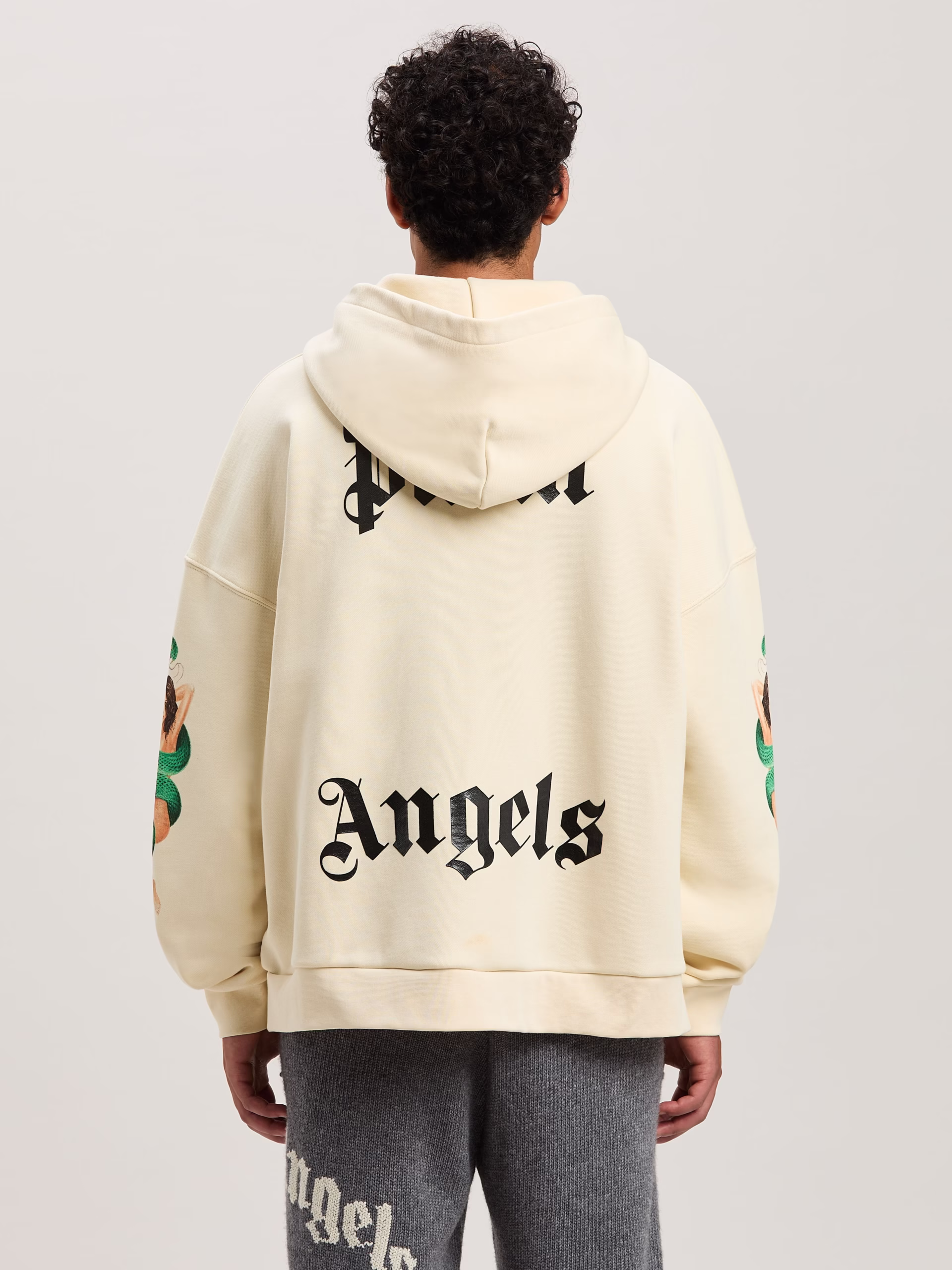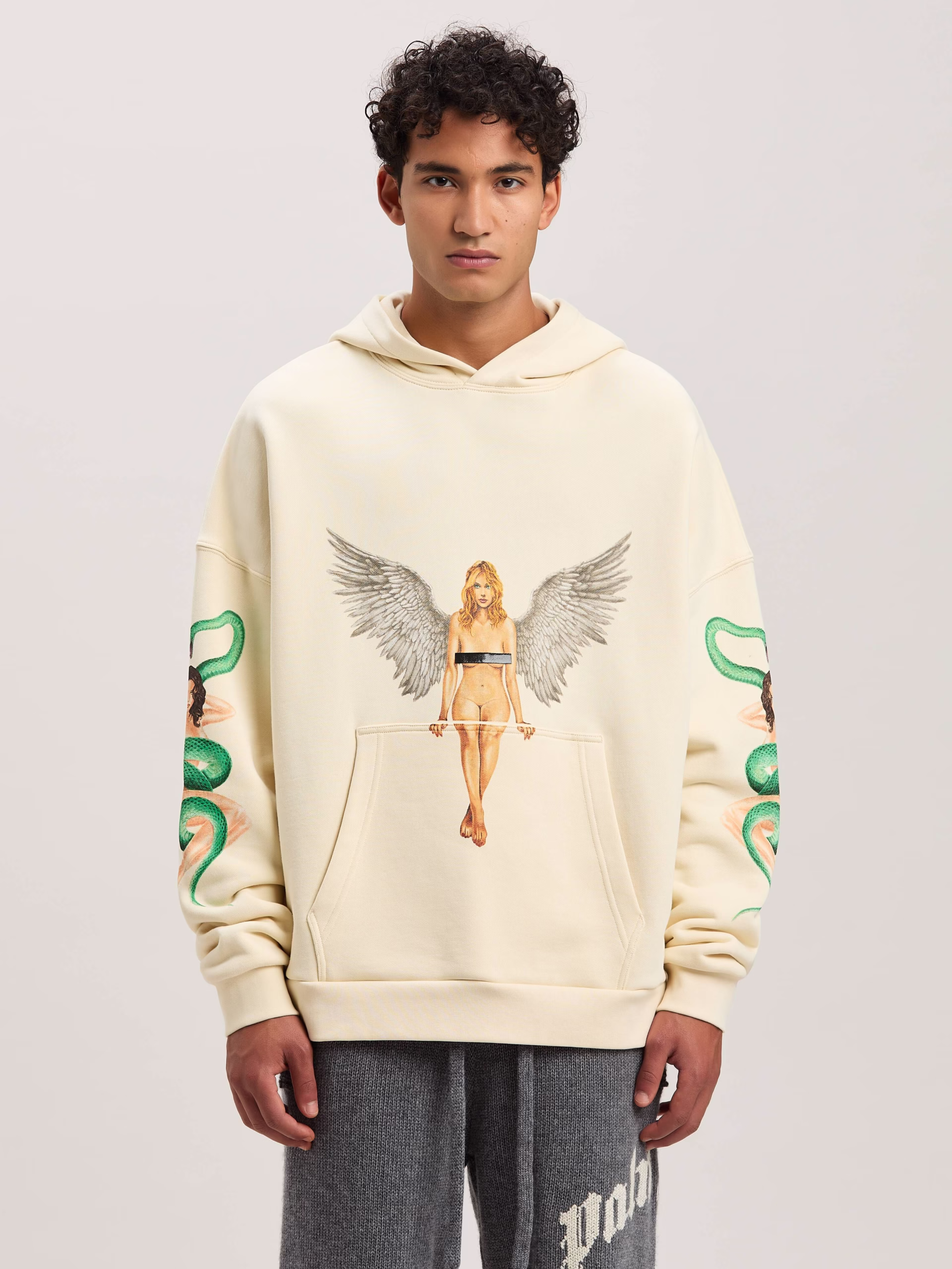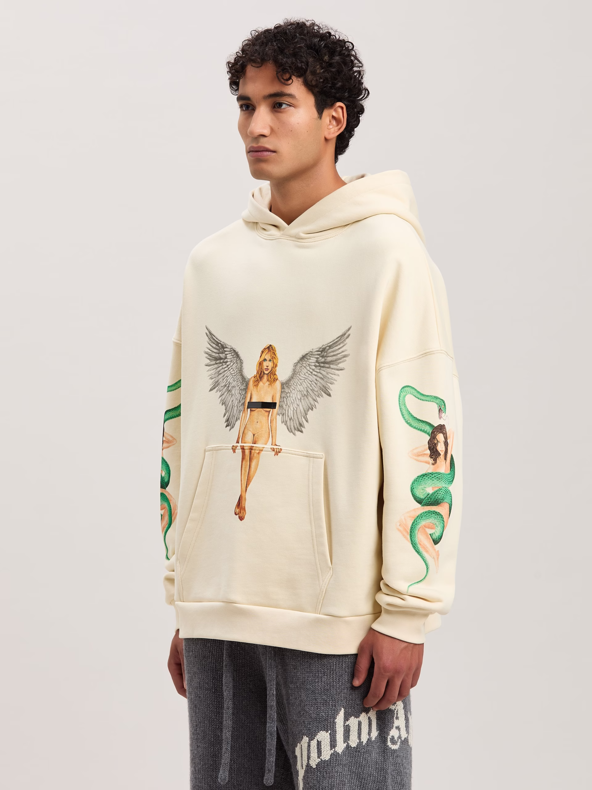 A unique original print inspired by vintage pin-ups, hybridized with elements from Palm Angels’ world. Men’s ivory hoodie with pou