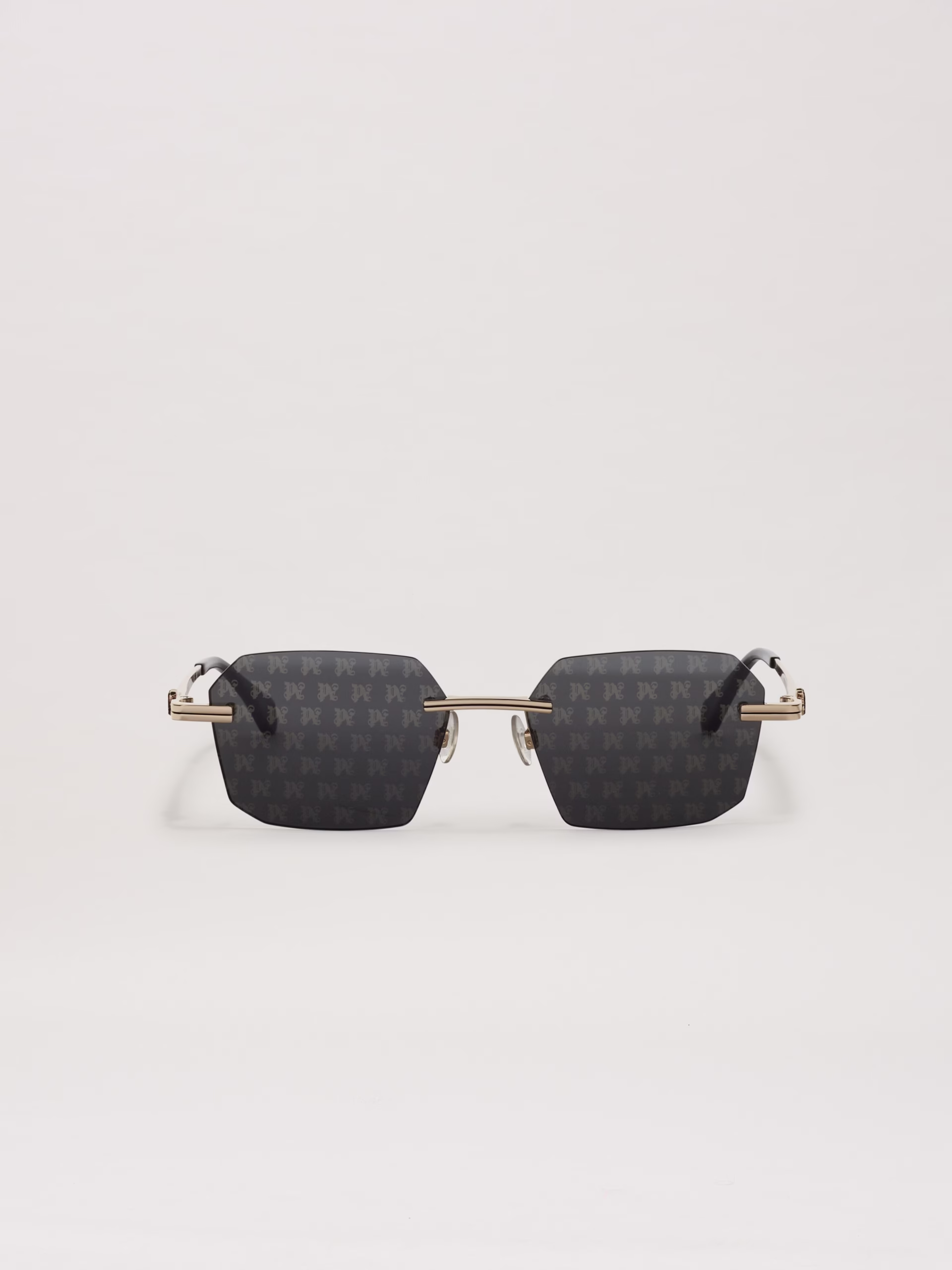 Bold minimalism, featuring an invisible frame and a pattern on the lenses. Hexagonal shaped lenses, with gold metal bridge and tem