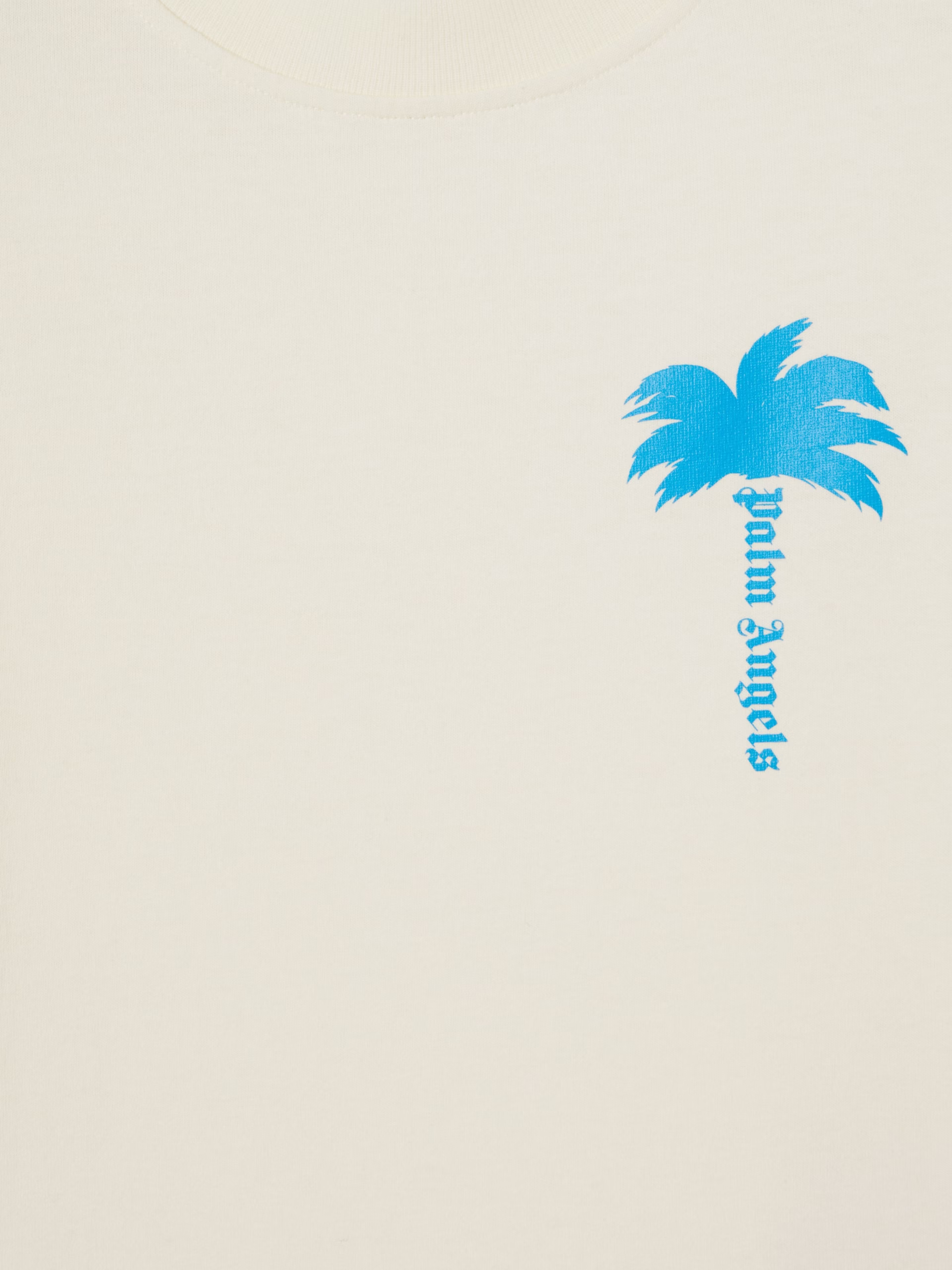 The Palm logo has new bright versions in the mood with summer. White short-sleeved T-shirt with neon blue palm leaves and Palm Ang