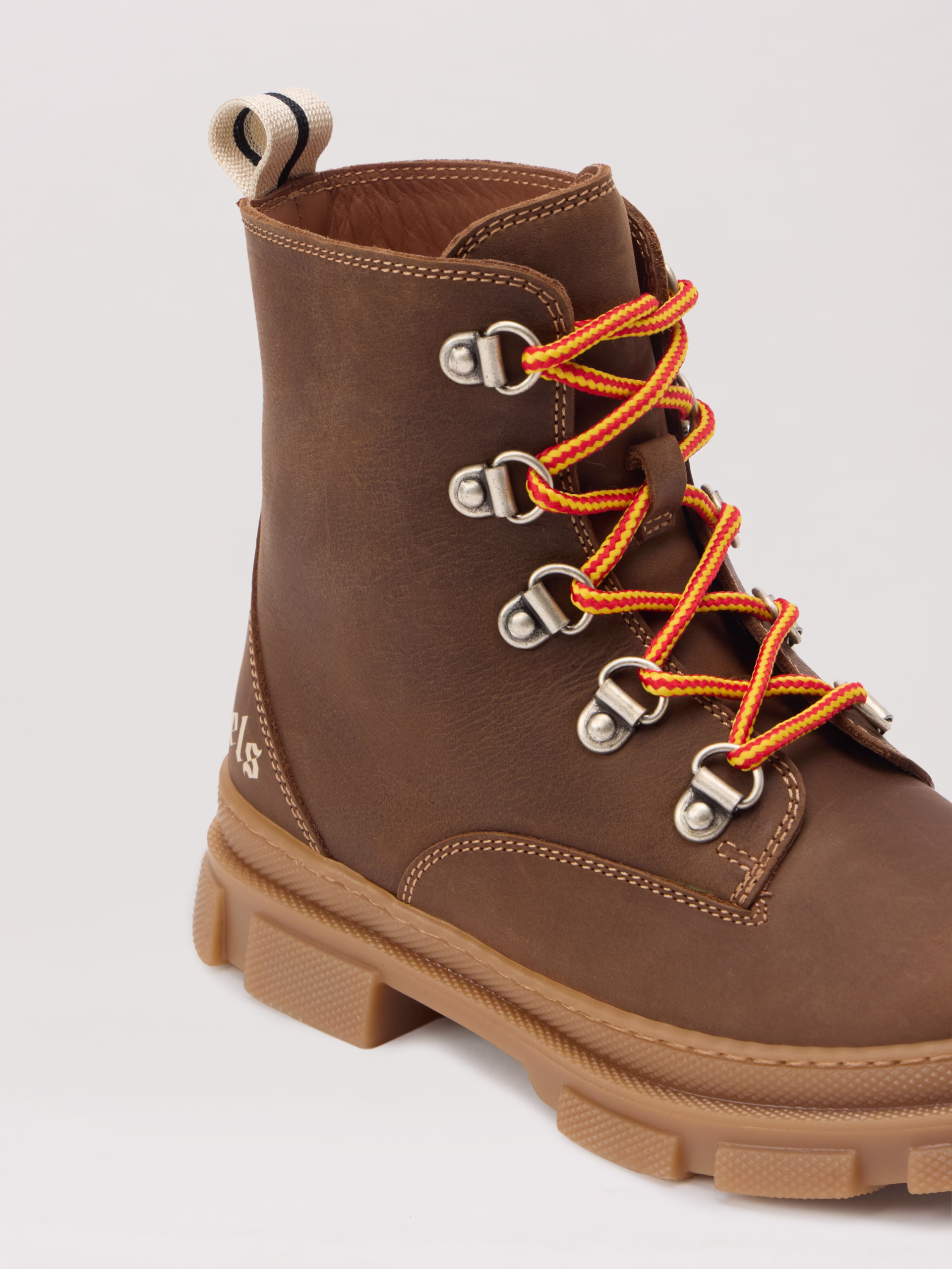 Rugged lace-up ankle boots in soft-grain leather, featuring durable lug soles and a distinct debossed logo at the rear.