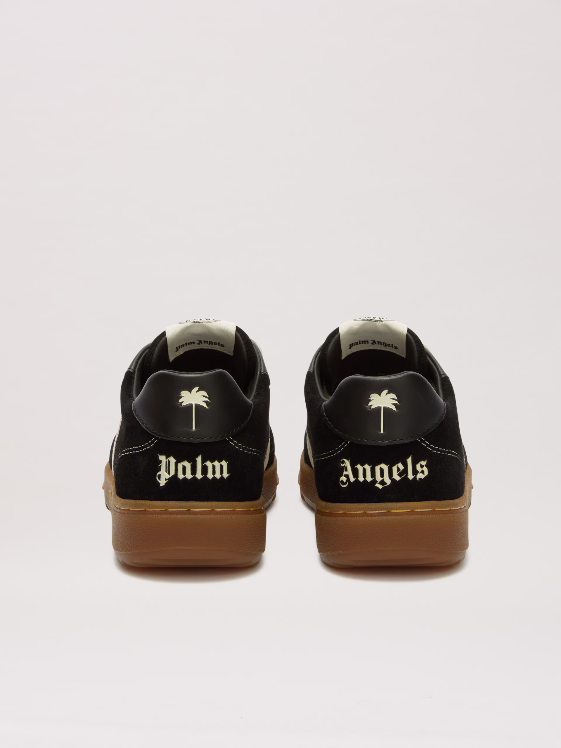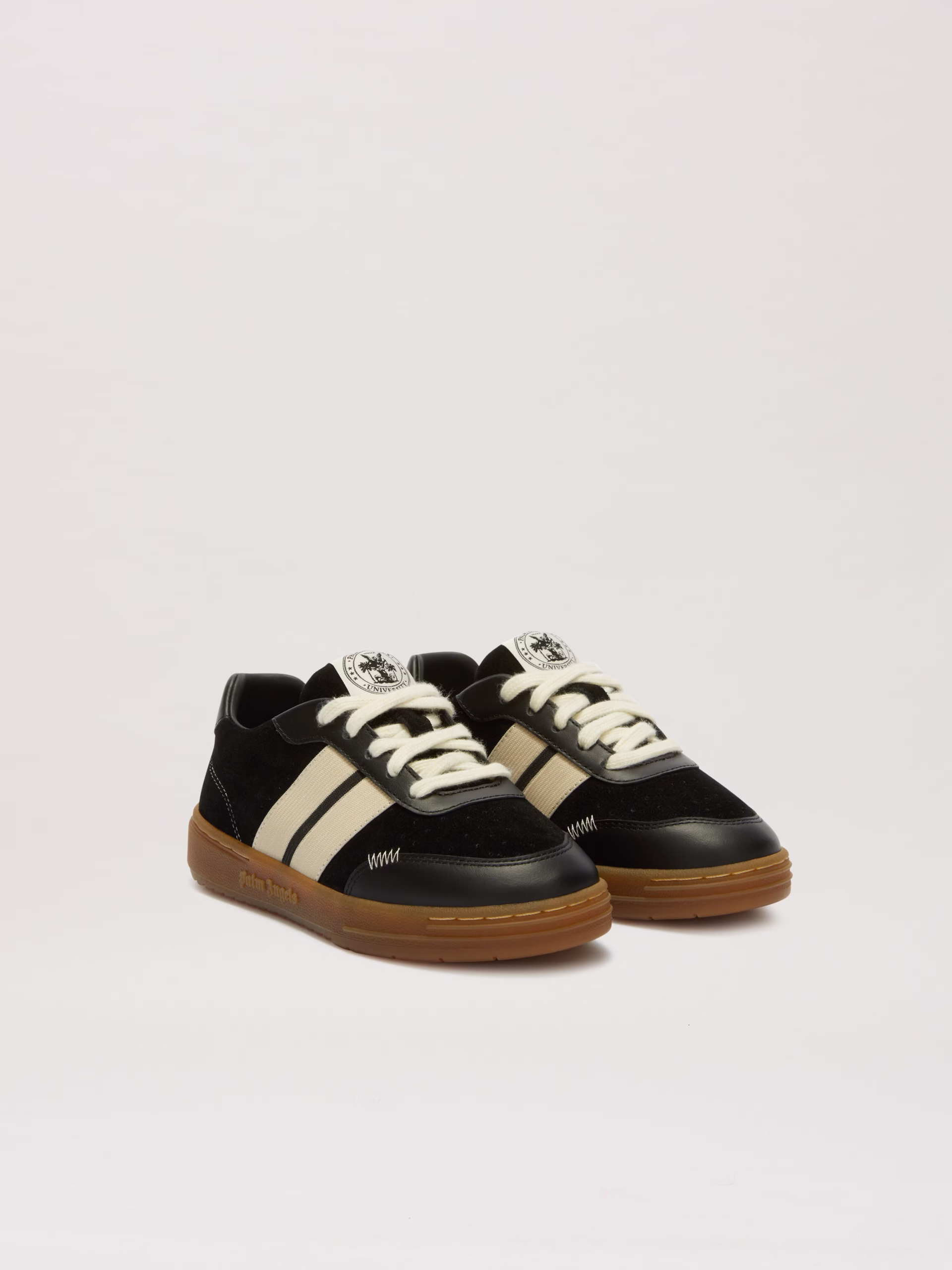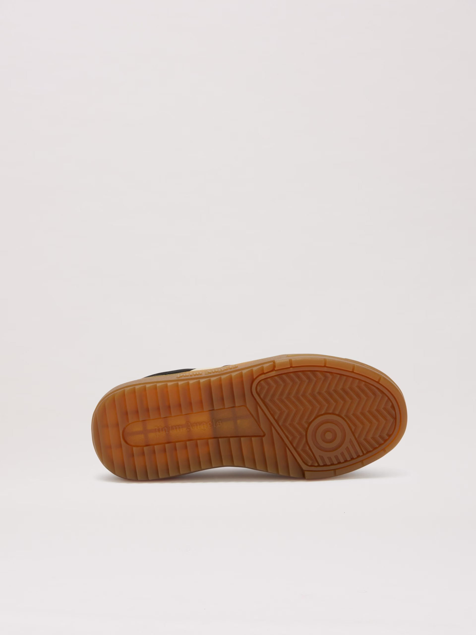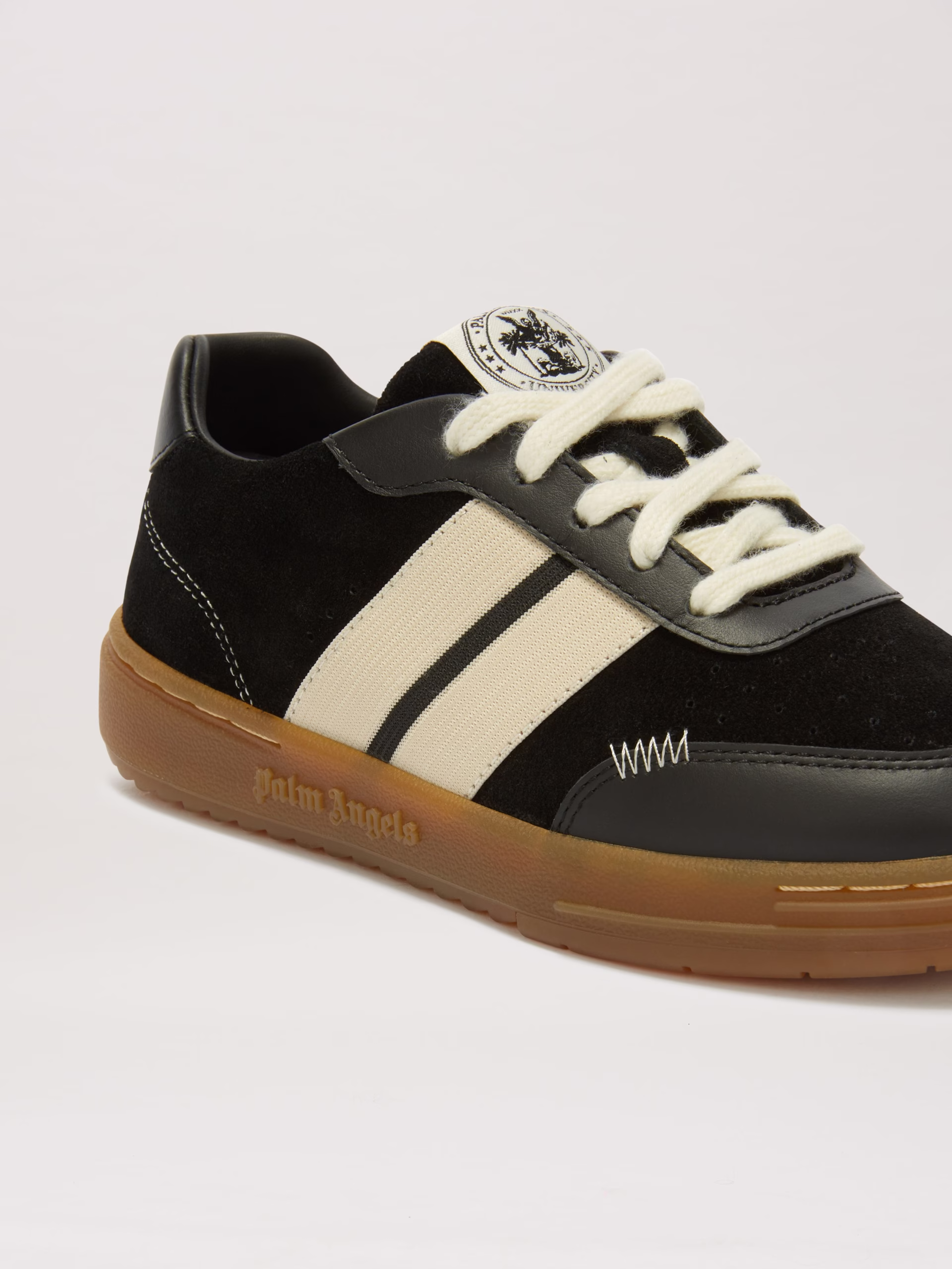 The Iconic Tape, symbol of Palm Angels tracksuit, reaches accessories. Boy’s black sneakers with caramel-colored sole and embosse