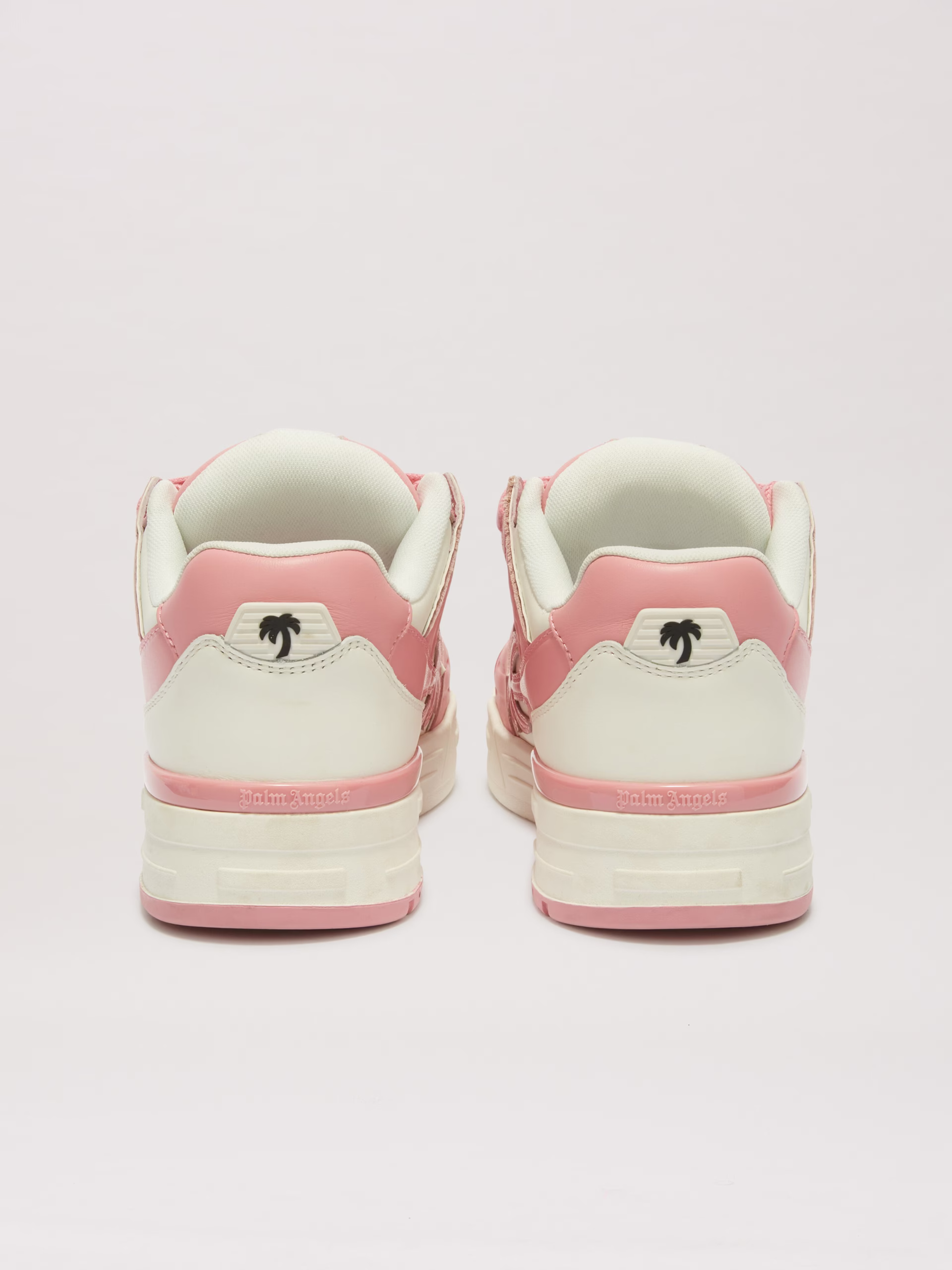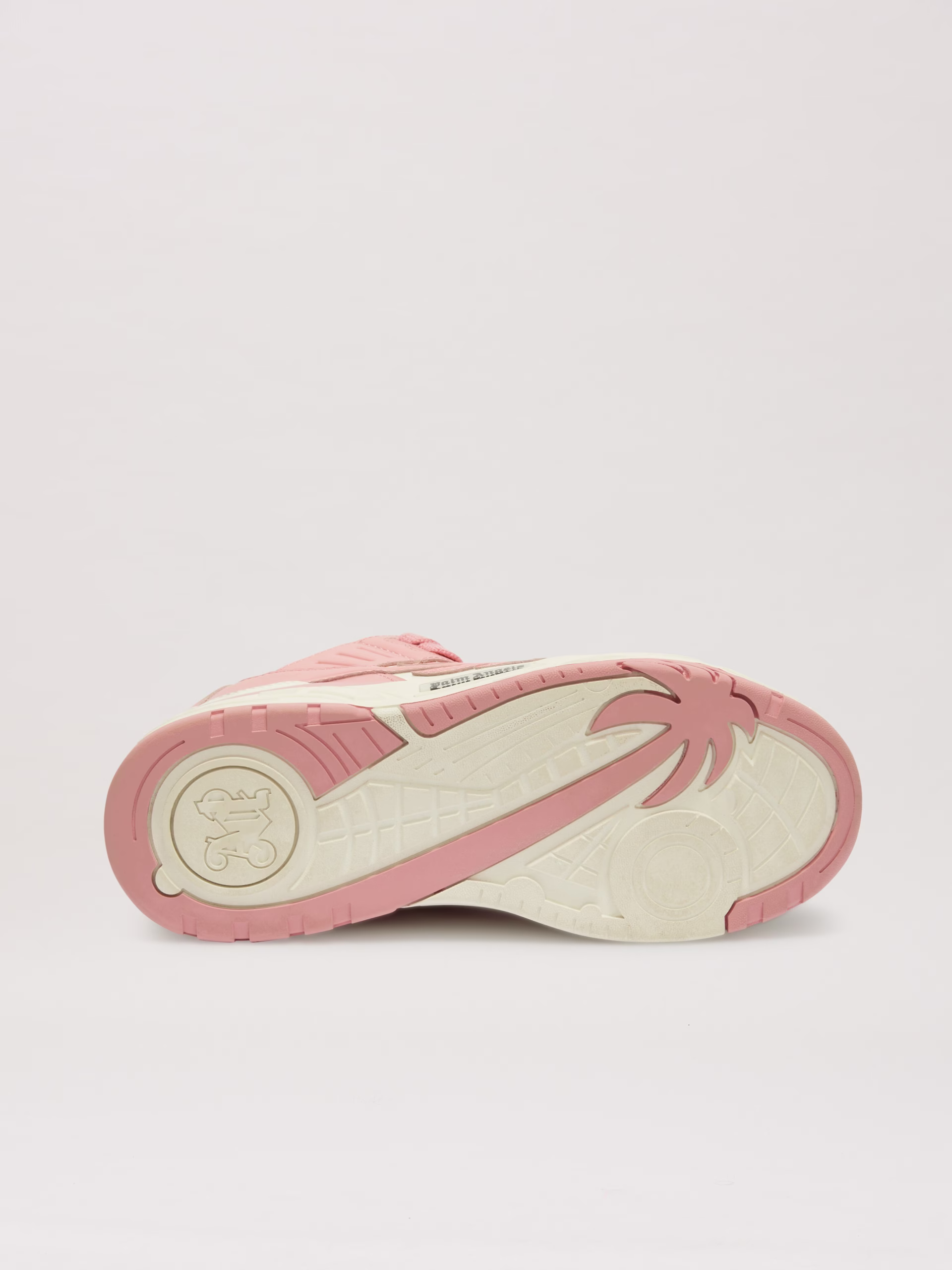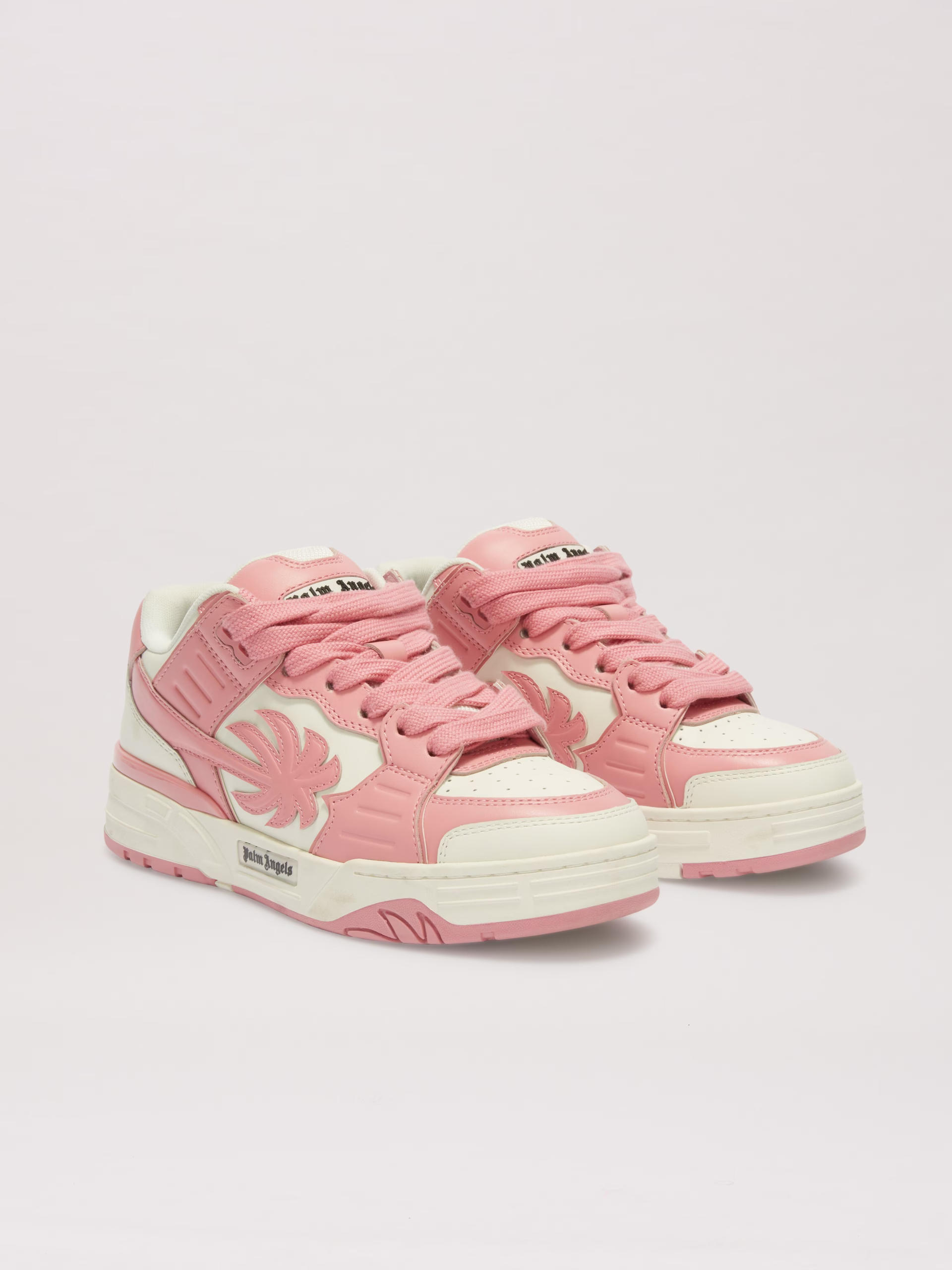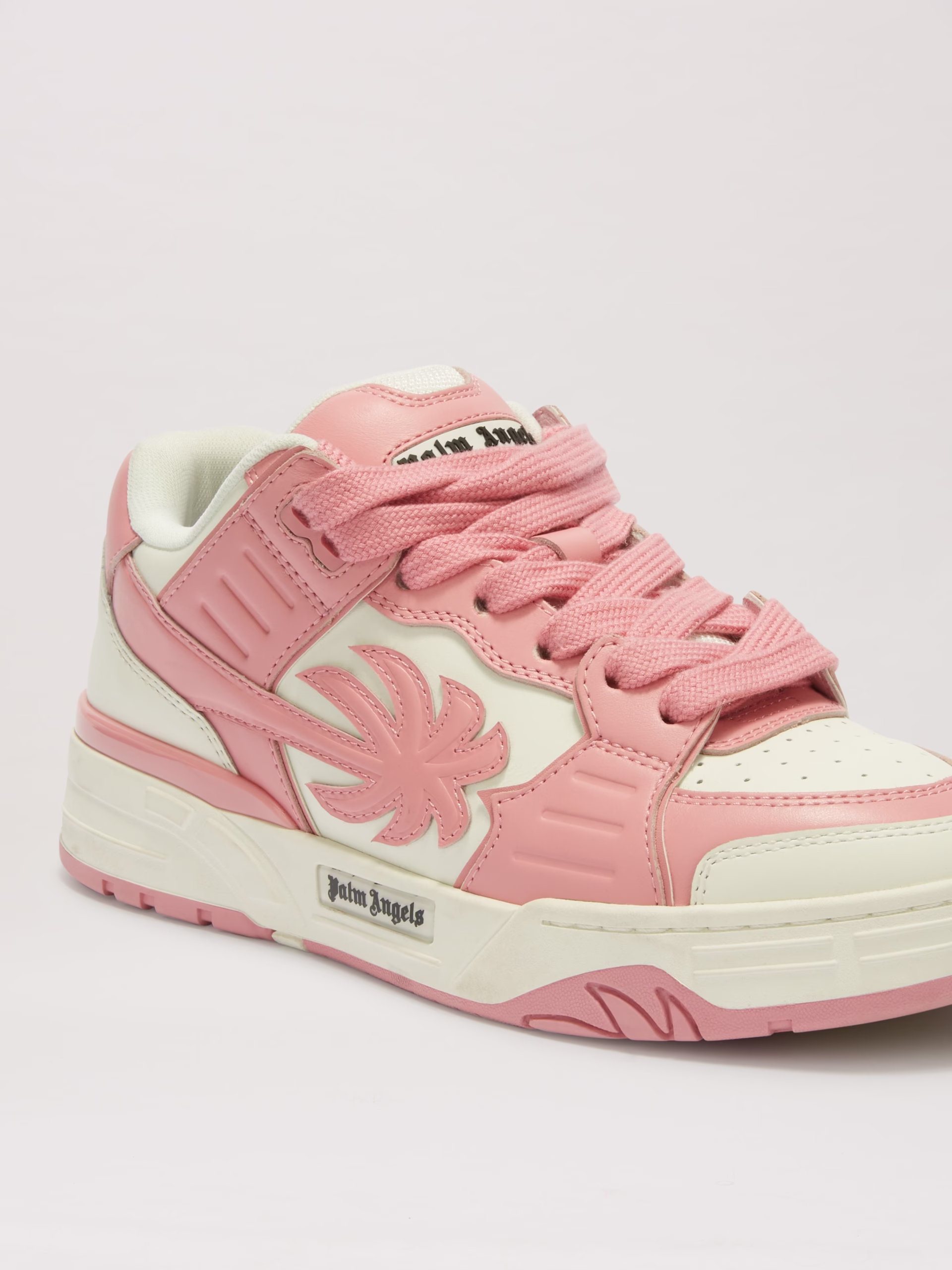 Skate silhouette and contrasting details for the new Venice. Women’s white sneaker with pink piping and inserts, high sole with em