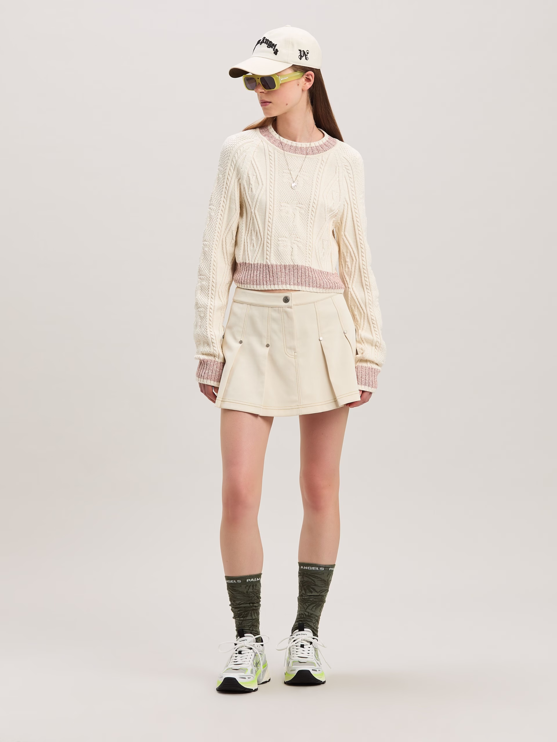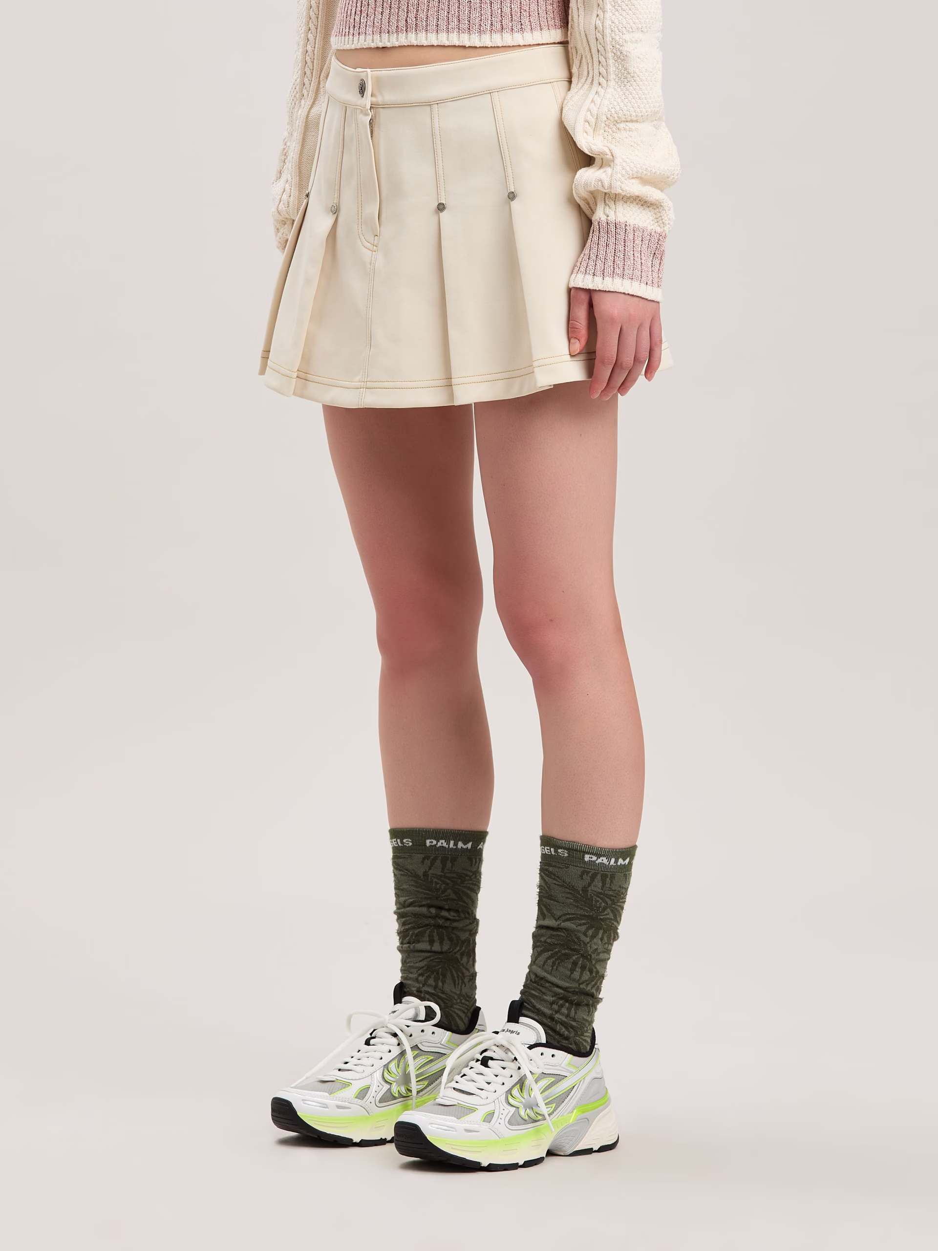 Preppy with a vintage feel. Women’s ivory vintage-effect fabric miniskirt with topstitching, flat pleats fastened by rivets, and b