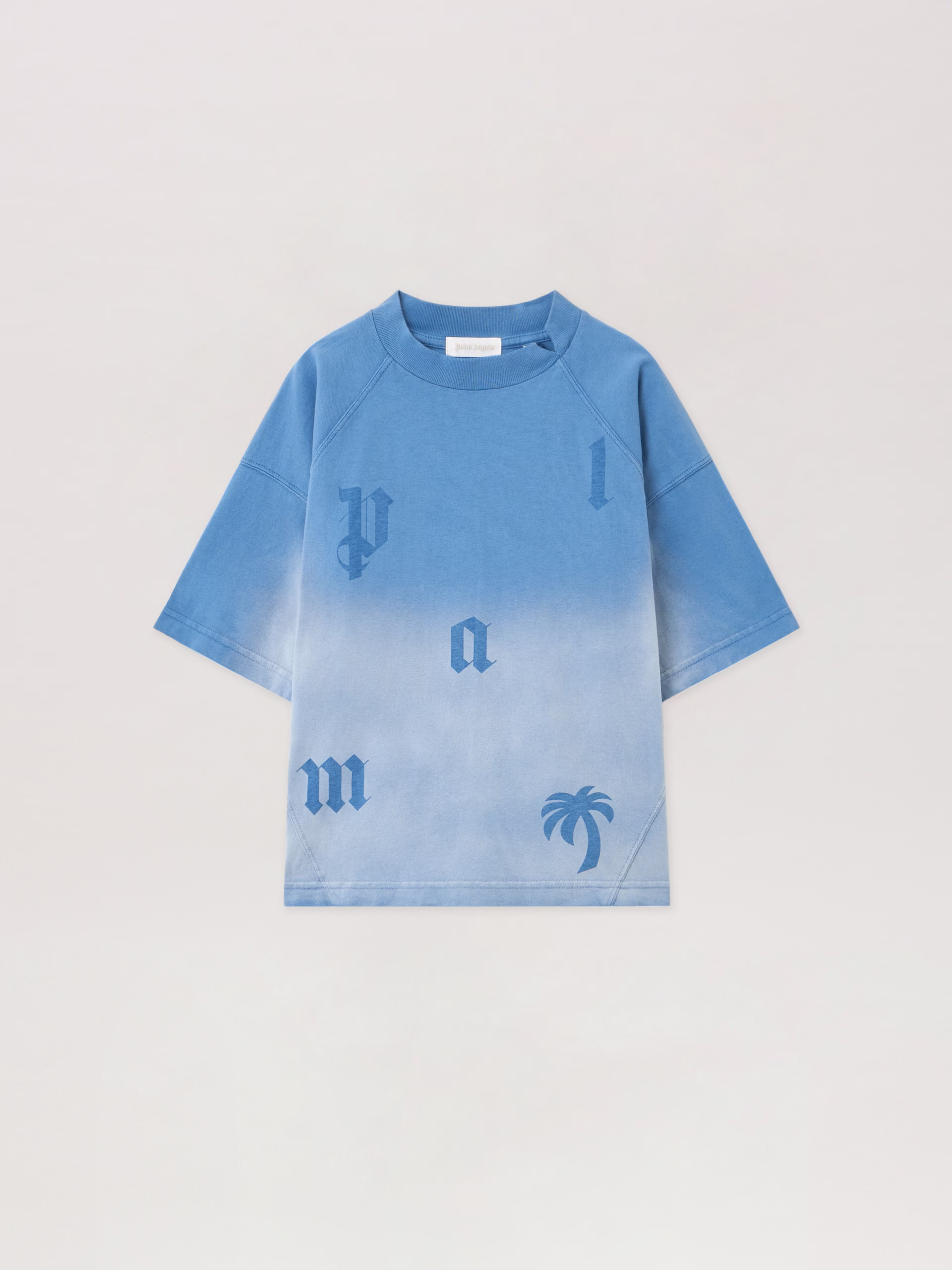 Raglan sleeve washed tee featuring a gradient effect and gothic letter motifs.Const