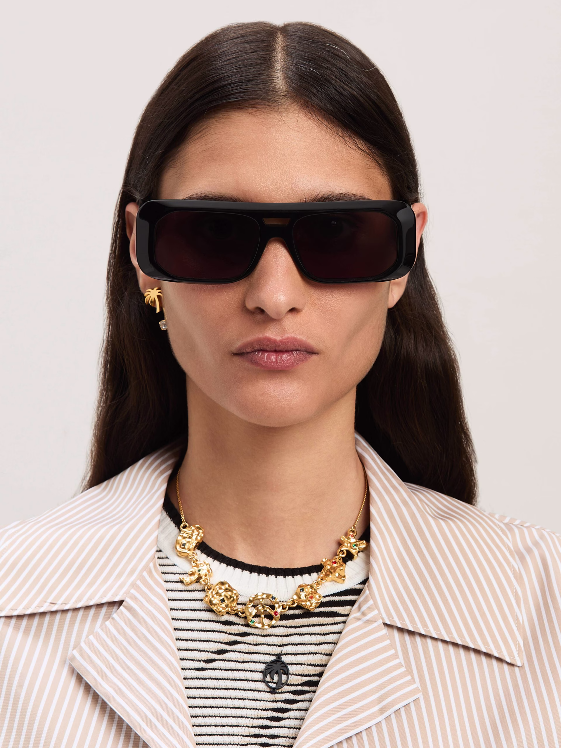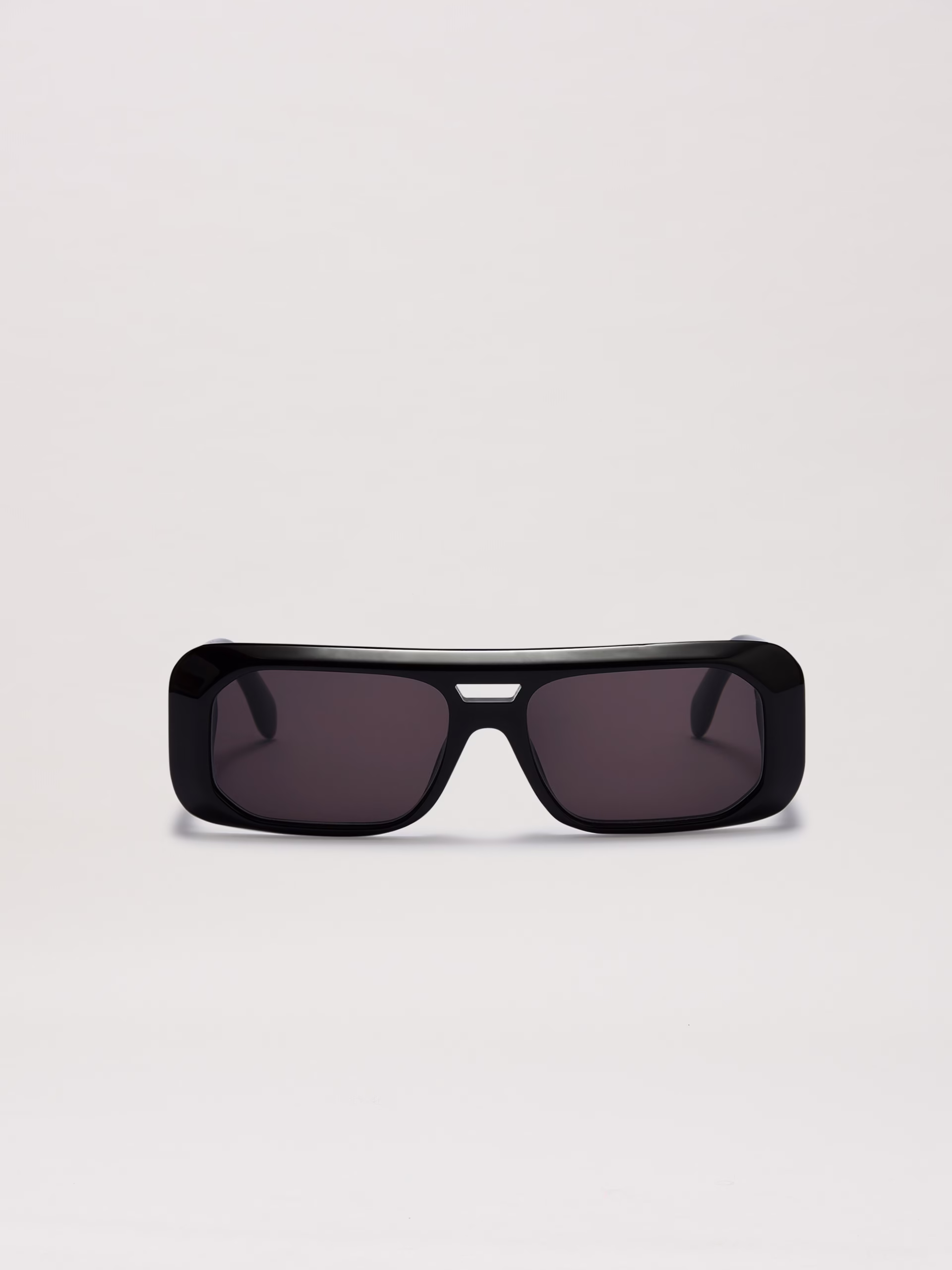 Retro shaped in ultra modern materials with a pilot-inspired front bridge. Black rectangular frame in glossy acetate with front br